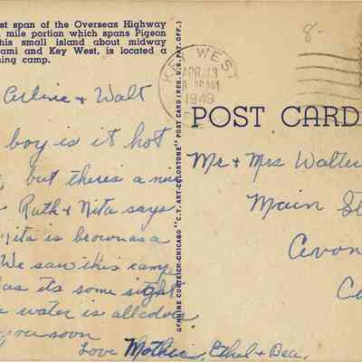 Dear Arline & Walt, Oh boy is it hot to-day, but there's a nice breeze. Ruth & Nita says hello. Nita is brown as a bear. We saw this camp from the but it's some sight to see. The water is all colors. Well see you soon. Love, Mother, Ethel & BeaDimensions