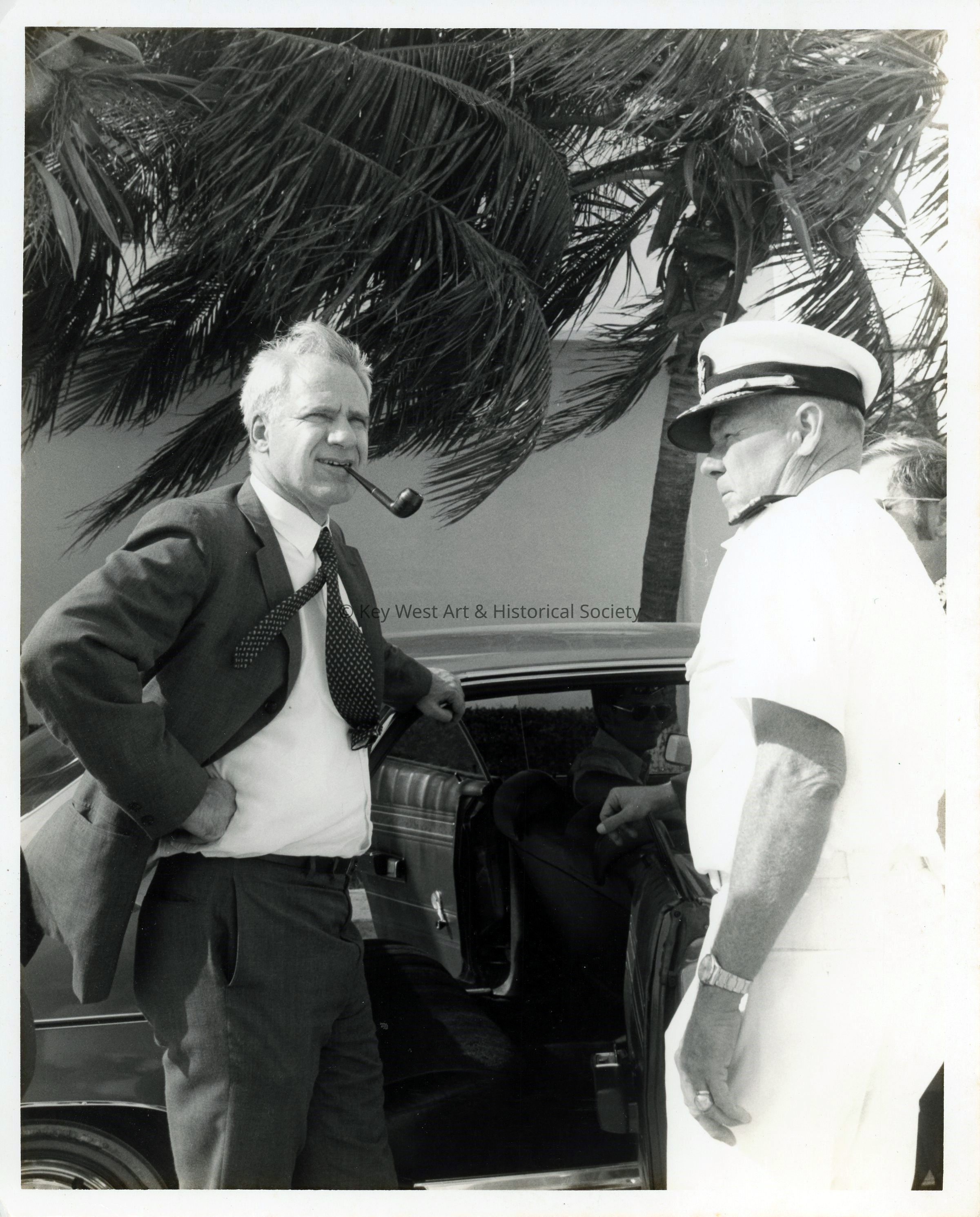 Black and white photograph Rear Admiral Jason Maurer and US Secretary of Defense James Schlesinger at Naval Station Key West.