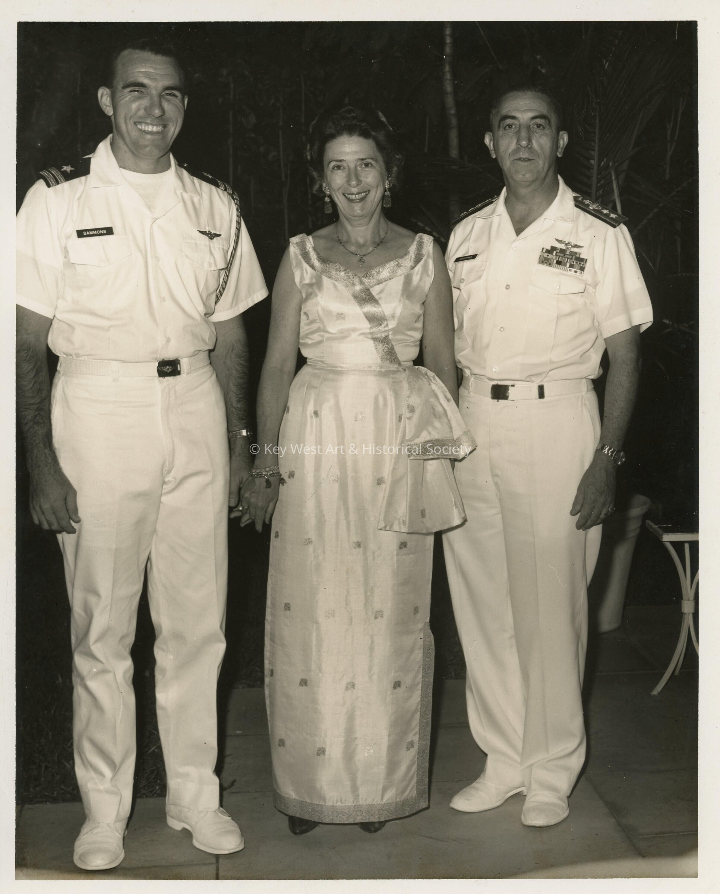 2 Men in uniform and a woman standing in between them at the Navy ball.