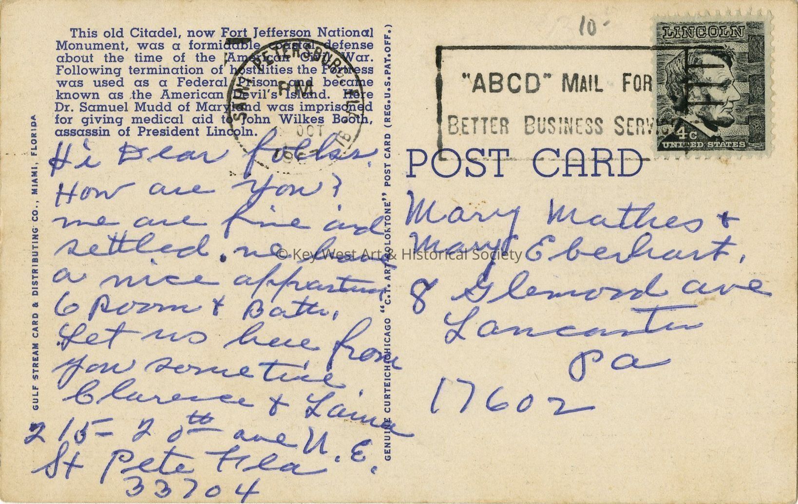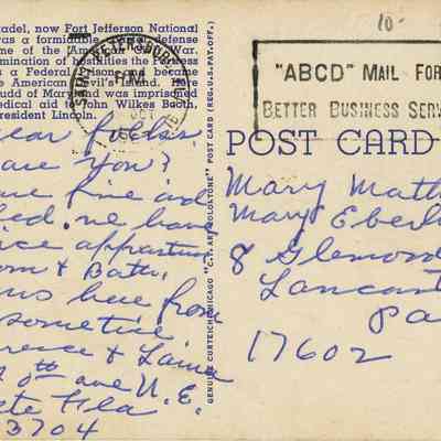 Postcard depicting old Fort Jefferson on the Dry Tortugas located about 60 miles from Key West, Florida. " The old Citadel, now Fort Jefferson National Monument, was a formidable coastal defense about the time of the American Civil War. Following termination of hostilities the fortress was used as a federal prison and became known as the American Devil's Island. Here Dr. Samuel Mudd of Maryland was imprisoned for giving medical aid to John Wilkes Booth, assassin of President Lincoln."Collection