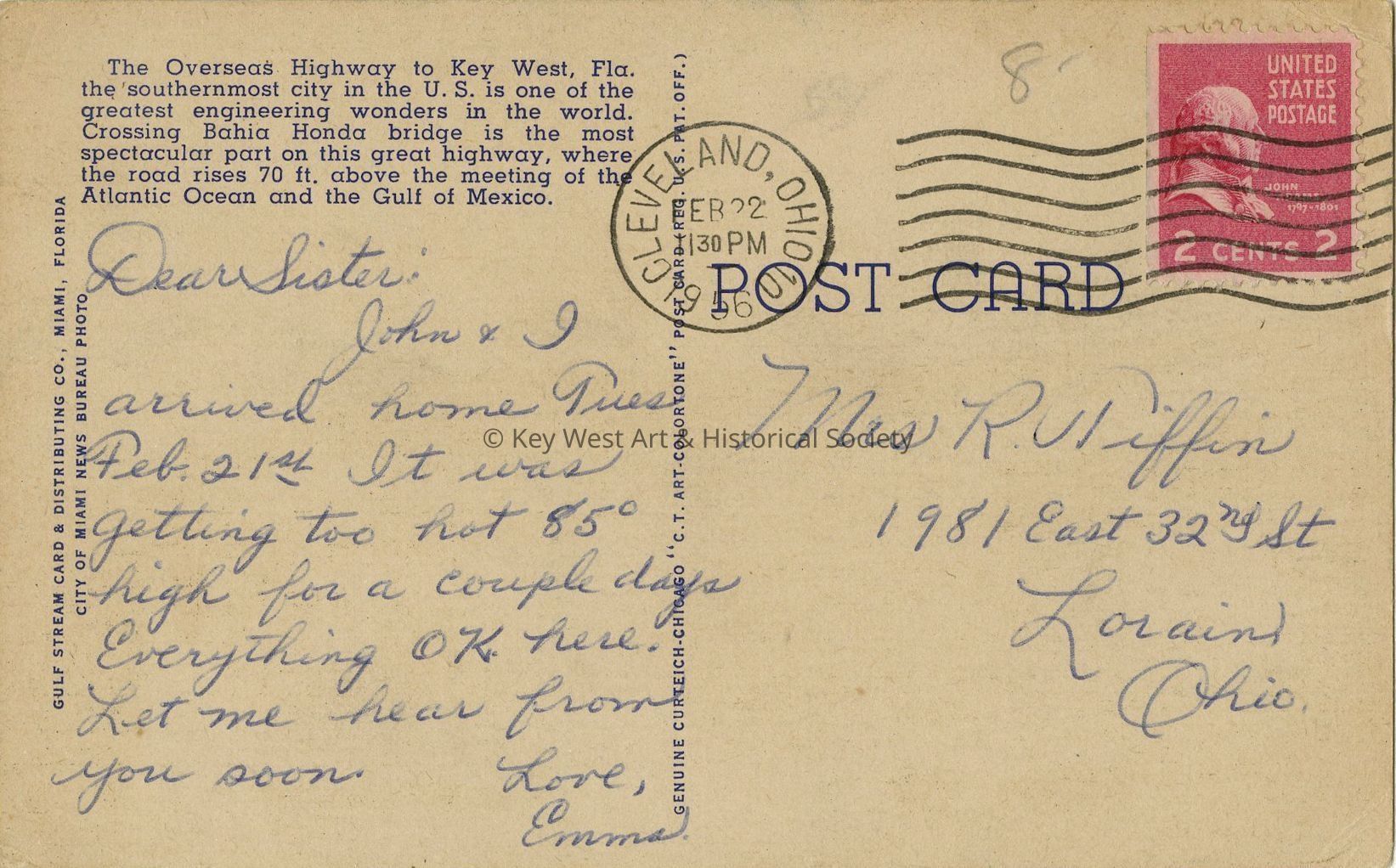 Dear Sister: John & I arrived home Tues. Feb. 21st. It was getting too hot 85 degrees high for a couple days. Everything OK here. Let me hear from you soon. Love, EmmaDimensions