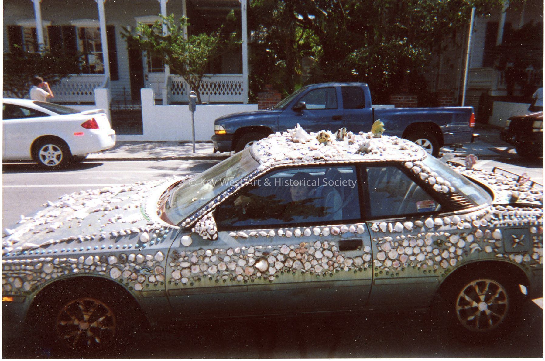Photograph of Nancy Loewy in her car. The vehicle has been heavily decorated with shells and fake fish.