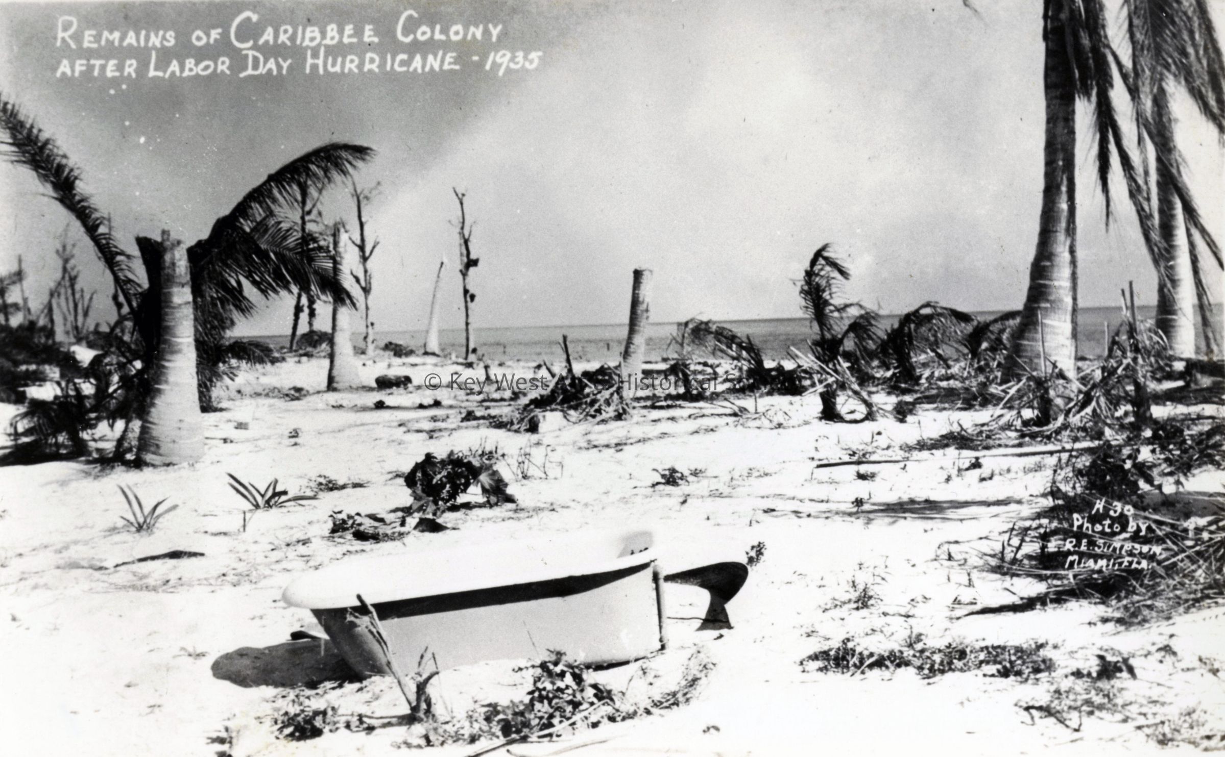 Black and white photograph of the remains of the Caribbee Colony in Islamorada following the Labor Day Hurricane of 1935.