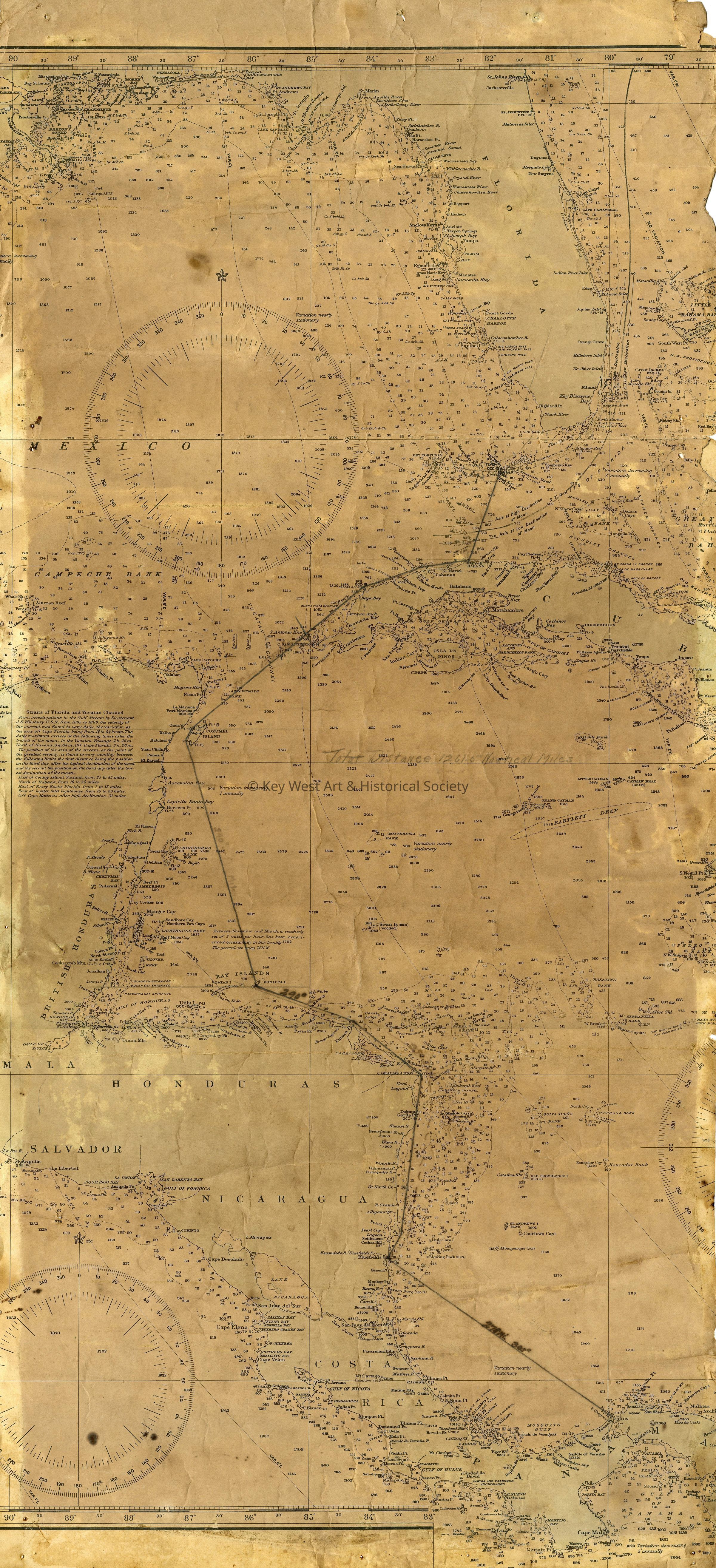 Section of a nautical chart of the western Caribbean and Florida belonging to Dr. Thomas Osgood Otto detailing the route of his 1919 flight from Panama to Key West via Bluefields and Cuba.