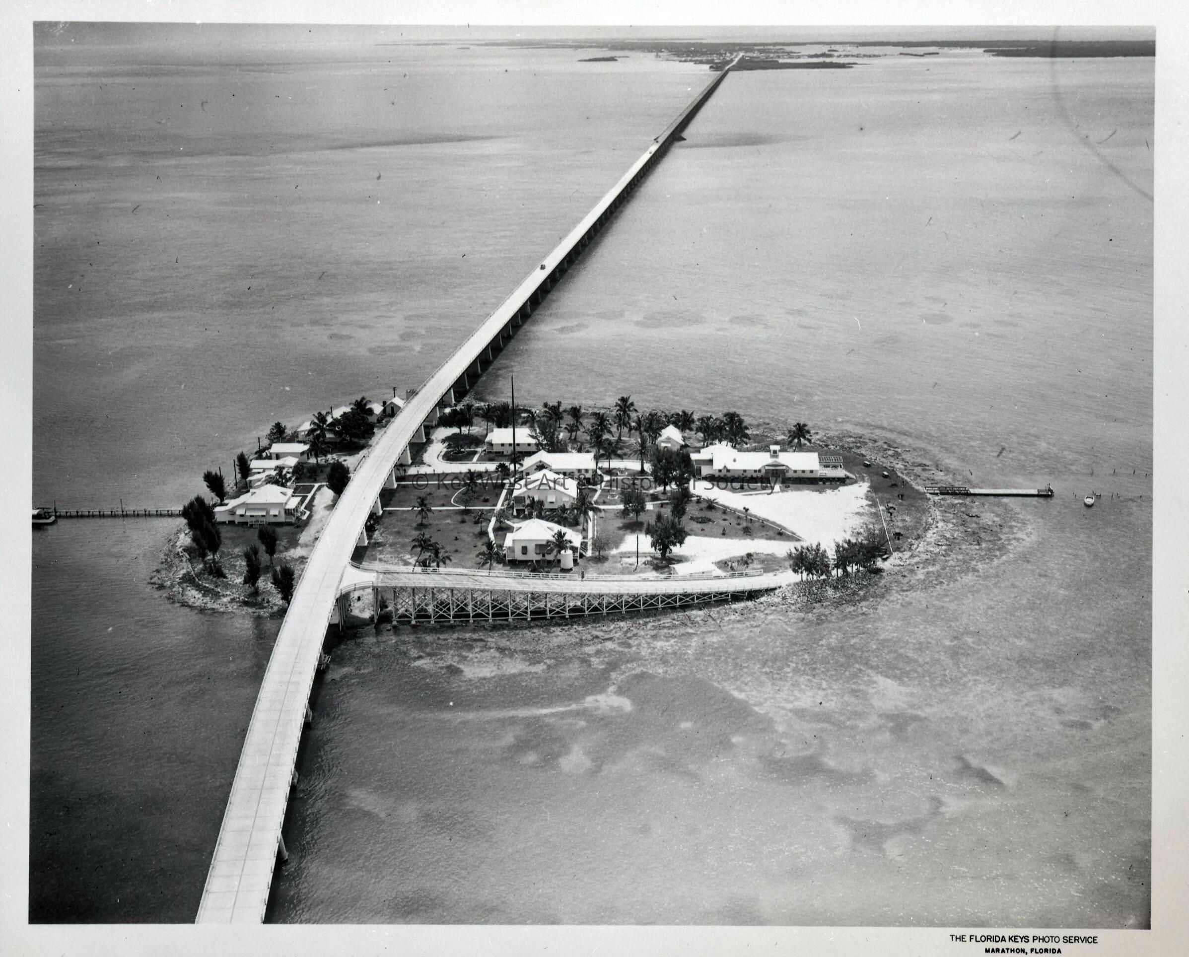 Black and white negative of the Overseas Highway (Seven Mile Bridge) over Pigeon Key.