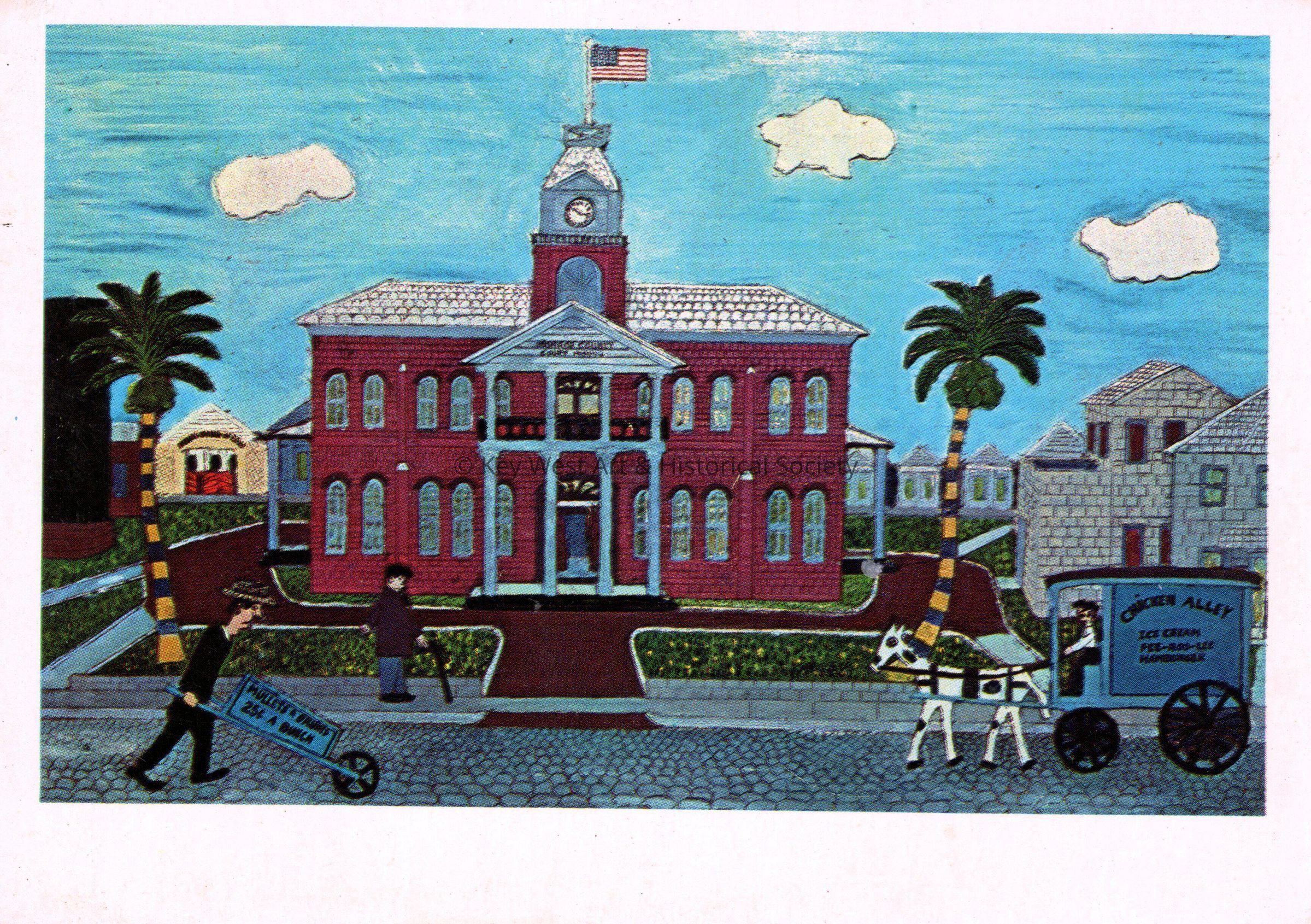 Postcard depicting a Mario Sanchez woodcarving of a courthouse with a horse-drawn wagon in front with a sign that reads, ‘Chicken Alley Ice Cream’. The description on the verso reads, 'Mario Sanchez. "1920 Taxpayers" - 1963 - Painted Woodcarving. Monroe County Court House, Key West, Florida (Whitehead Street between Southard and Fleming). Collection "El Kiosko", Key West, Florida.'Subject Place