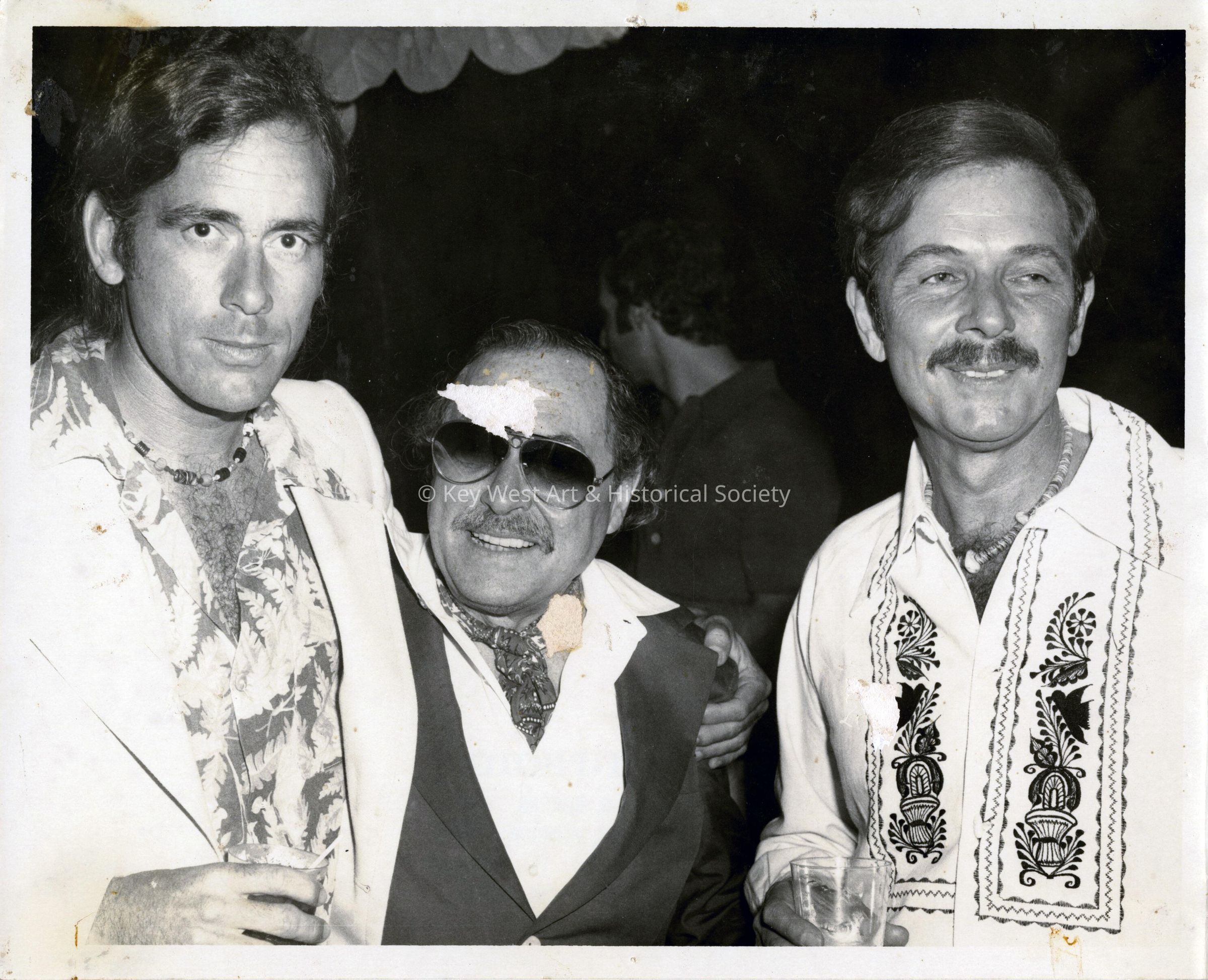 Black and white photograph of (l-r) Thomas McGuane, Tennessee Williams and James Kirkwood at the wrap-party for the film adaptation of McGuane's 'Ninety-two in the Shade' at Louie's Backyard.