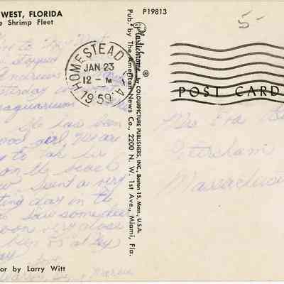 Postcard depicting shrimp boats rafted together at the dock in Key West, Florida.Collection