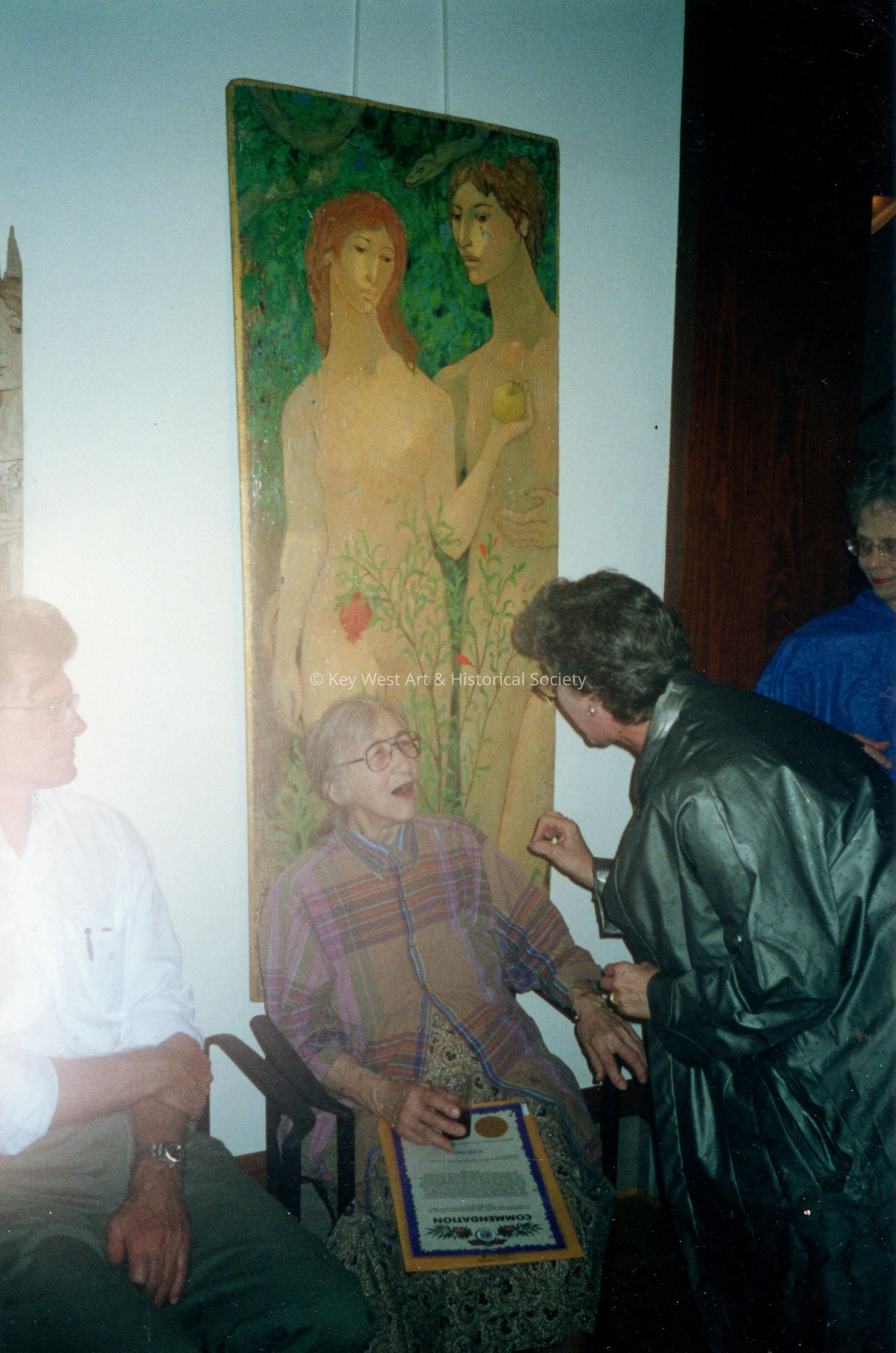 Color photograph of Suzie Zuzek dePoo with her artwork during an exhibition at the Key West Museum of Art & History in April 2001.