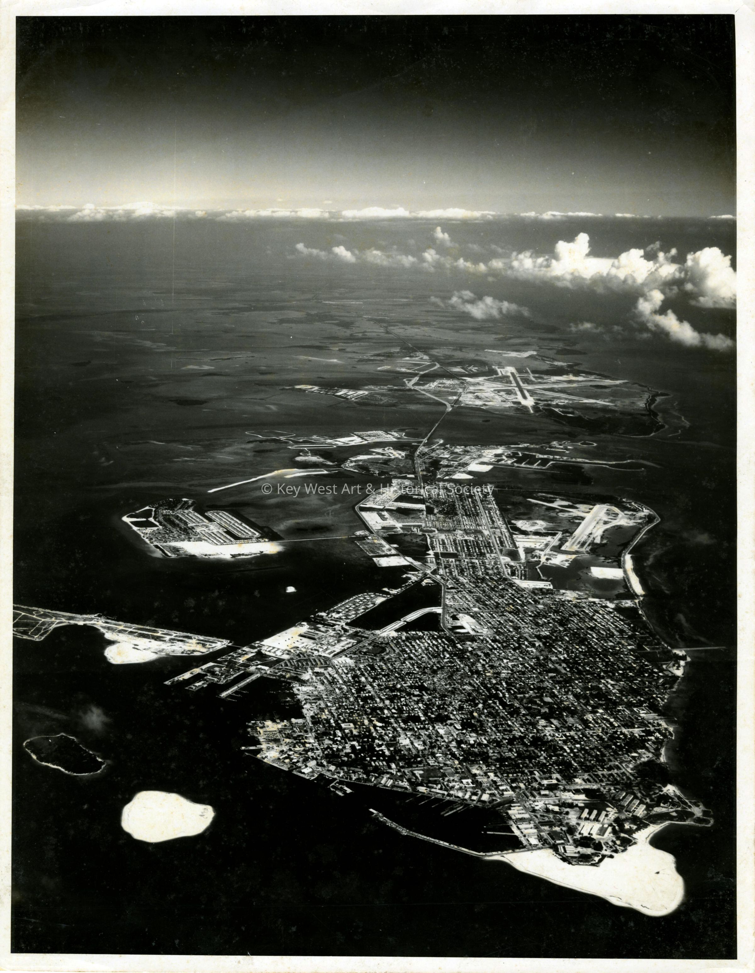 Black and white aerial photograph of Key West including Tank Island and Wisteria Island.
