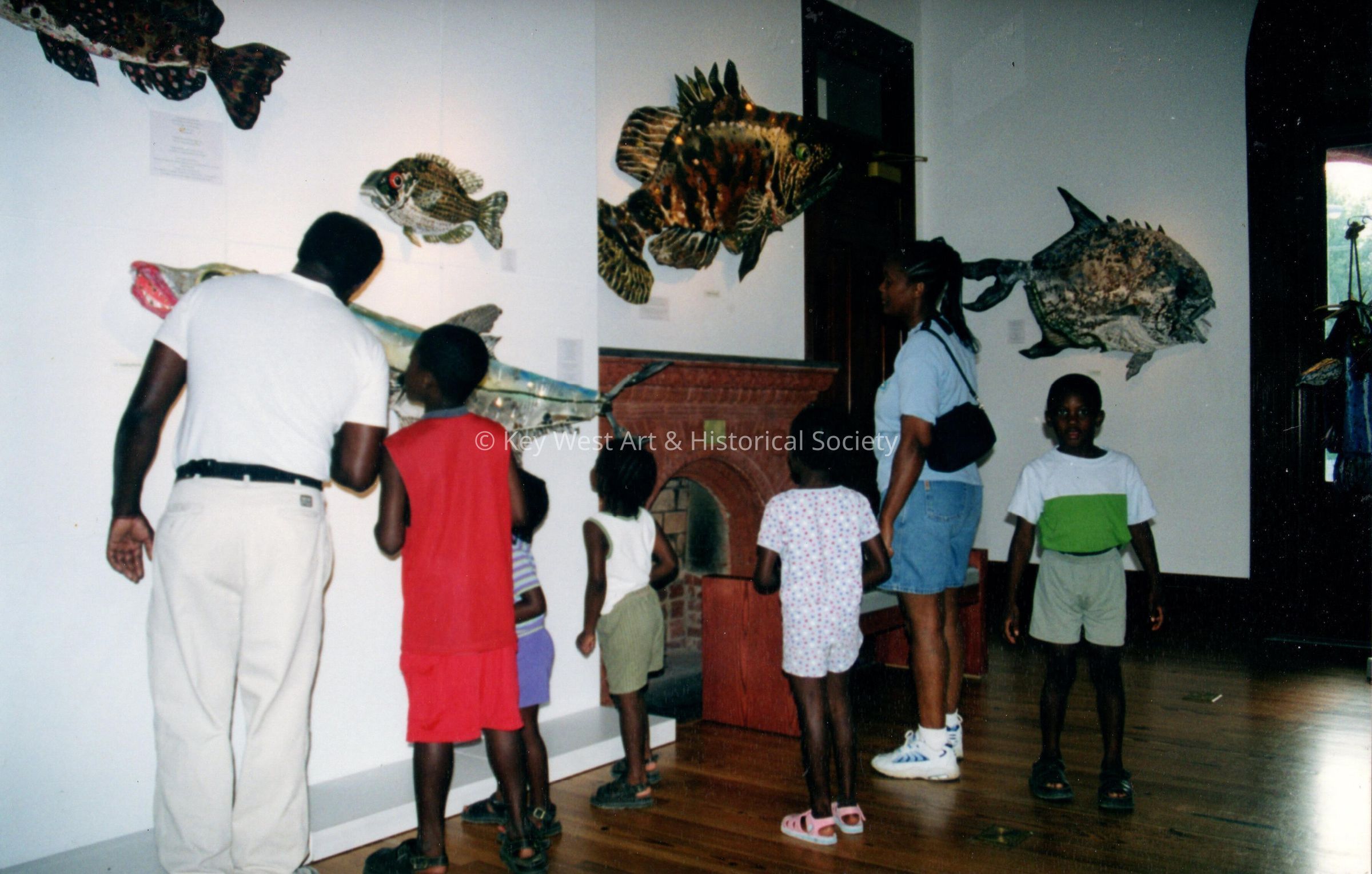 Color photograph of children and adults visiting the Captain Honk exhibit staged in the Bumpus Gallery of the Custom House Museum.Collection