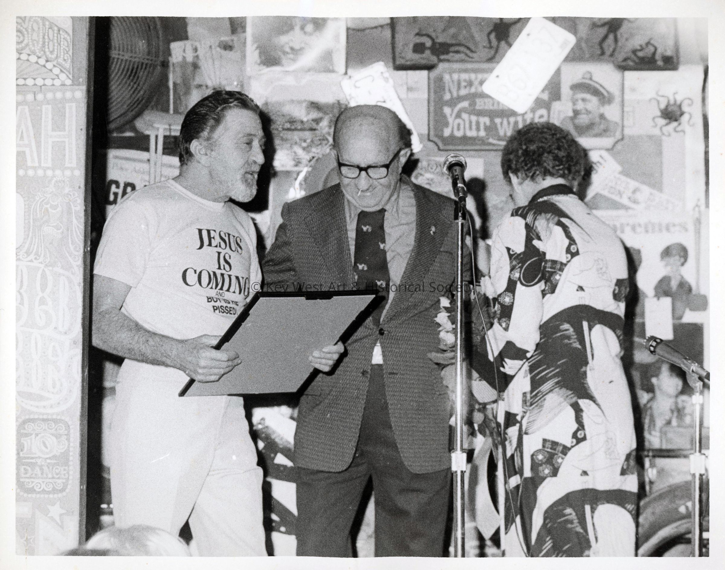 Black and white photograph of Captain Tony Tarracino, Gerald Saunders & Margaret Foresman, possibly inside Captain Tony's Saloon on Greene Street.Photograph Details