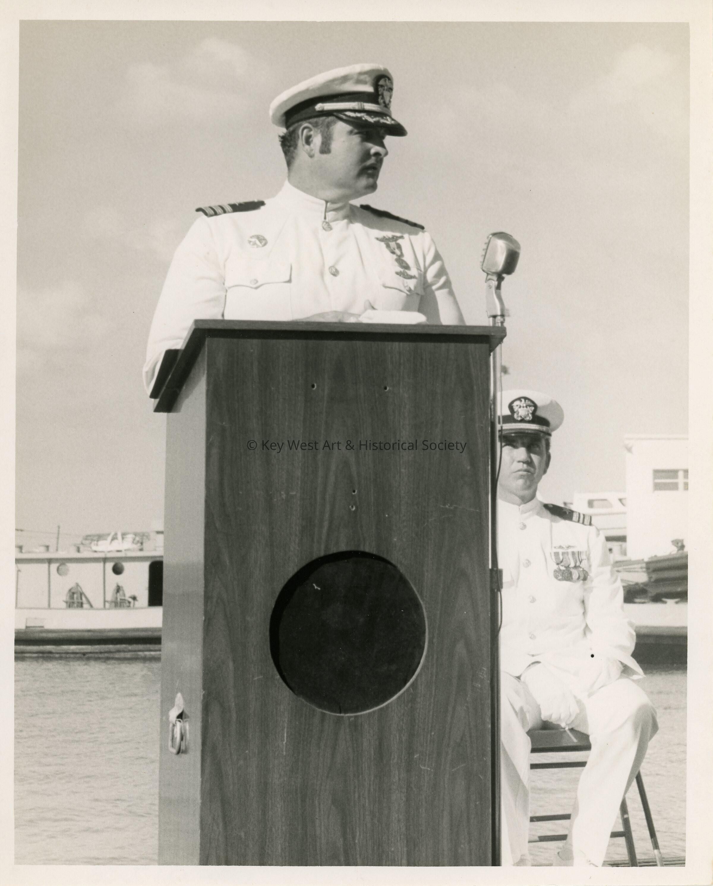 2 Unknown men in uniform, one sitting and one standing at the podium.Collection