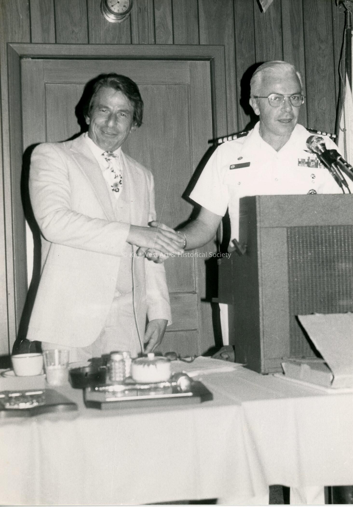2 Unknown men shaking hands standing behind a podiumEntry/Object ID
