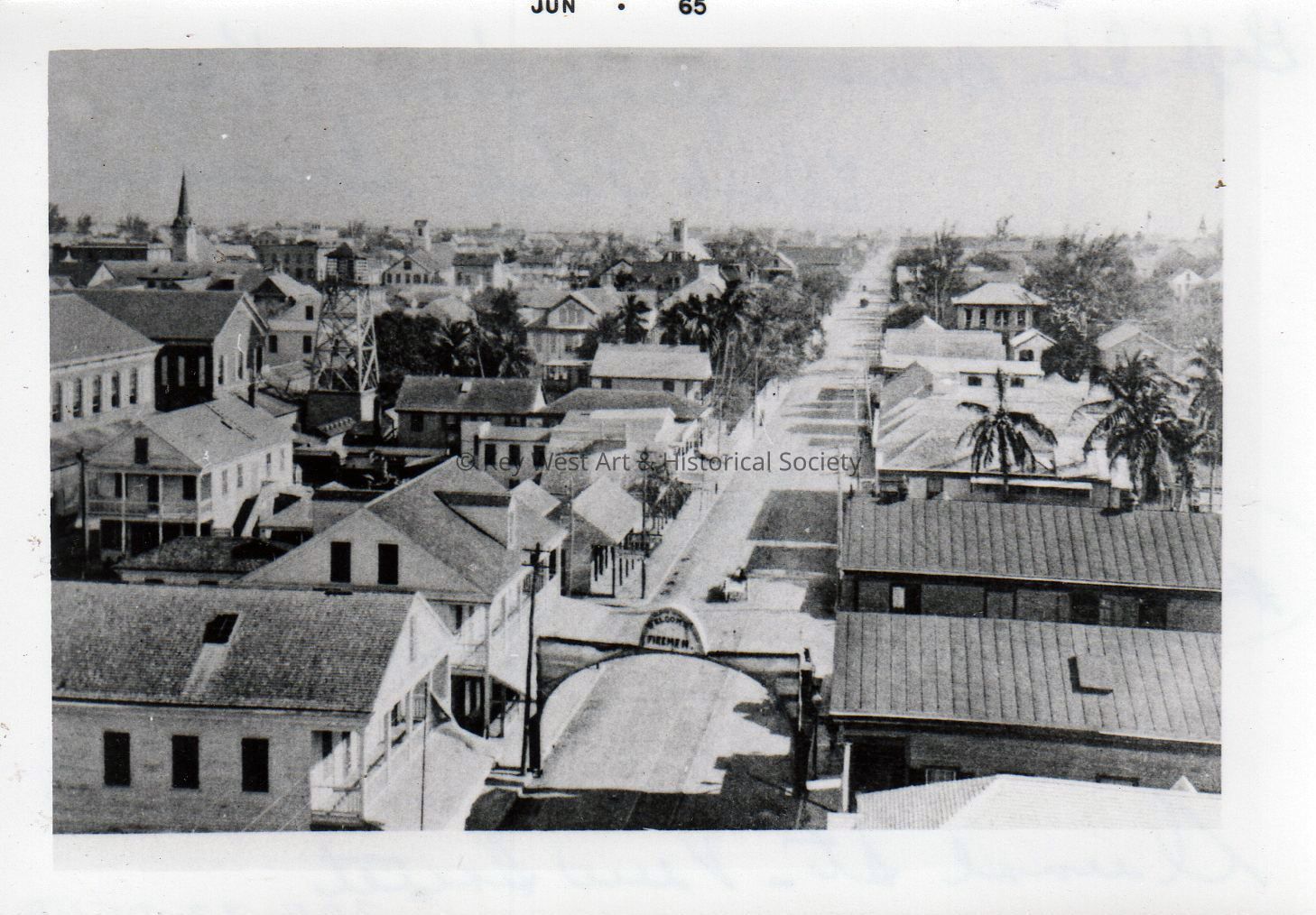 Black and white photograph of the 200 block of Duval Street looking south. The sign stretched across the street is to welcome a firemen convention.