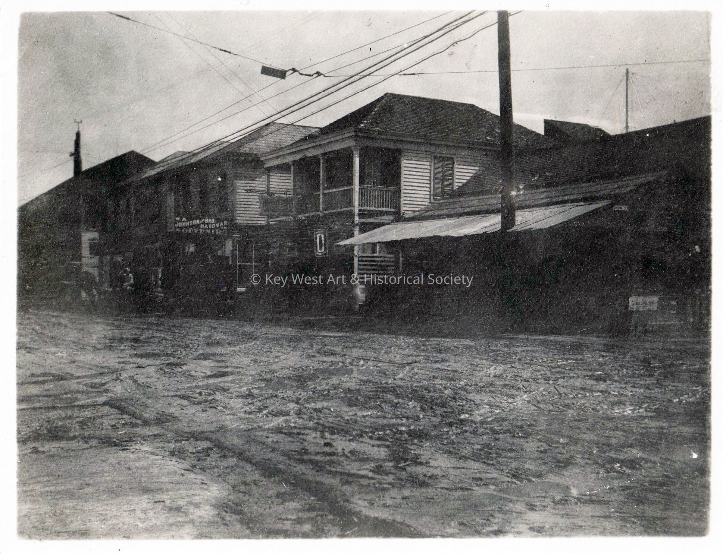 Black and white photo of the 200 block of Duval Street taken after the 1910 hurricane showing the storm damage. Photograph taken from the corner of Duval and Greene streets. Business visible is W.A. Johnson & Bro Hardware and Souvenir.