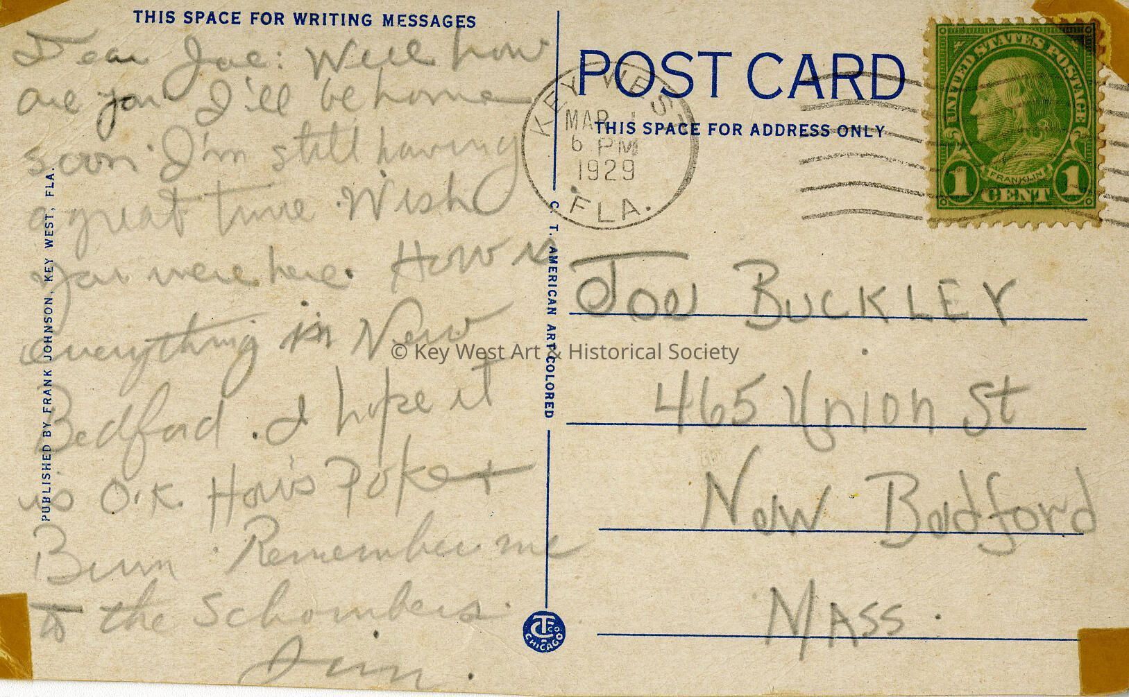 Postcard depicting the Casa Marina Hotel. The caption reads, ‘View from Casa Marina Hotel, Showing Most Southern Point in U.S.' The postcard was sent by James Buckley to his grandfather from Key West. Buckley worked at Casa Marina during the winter of 1928-1929.Subject Place