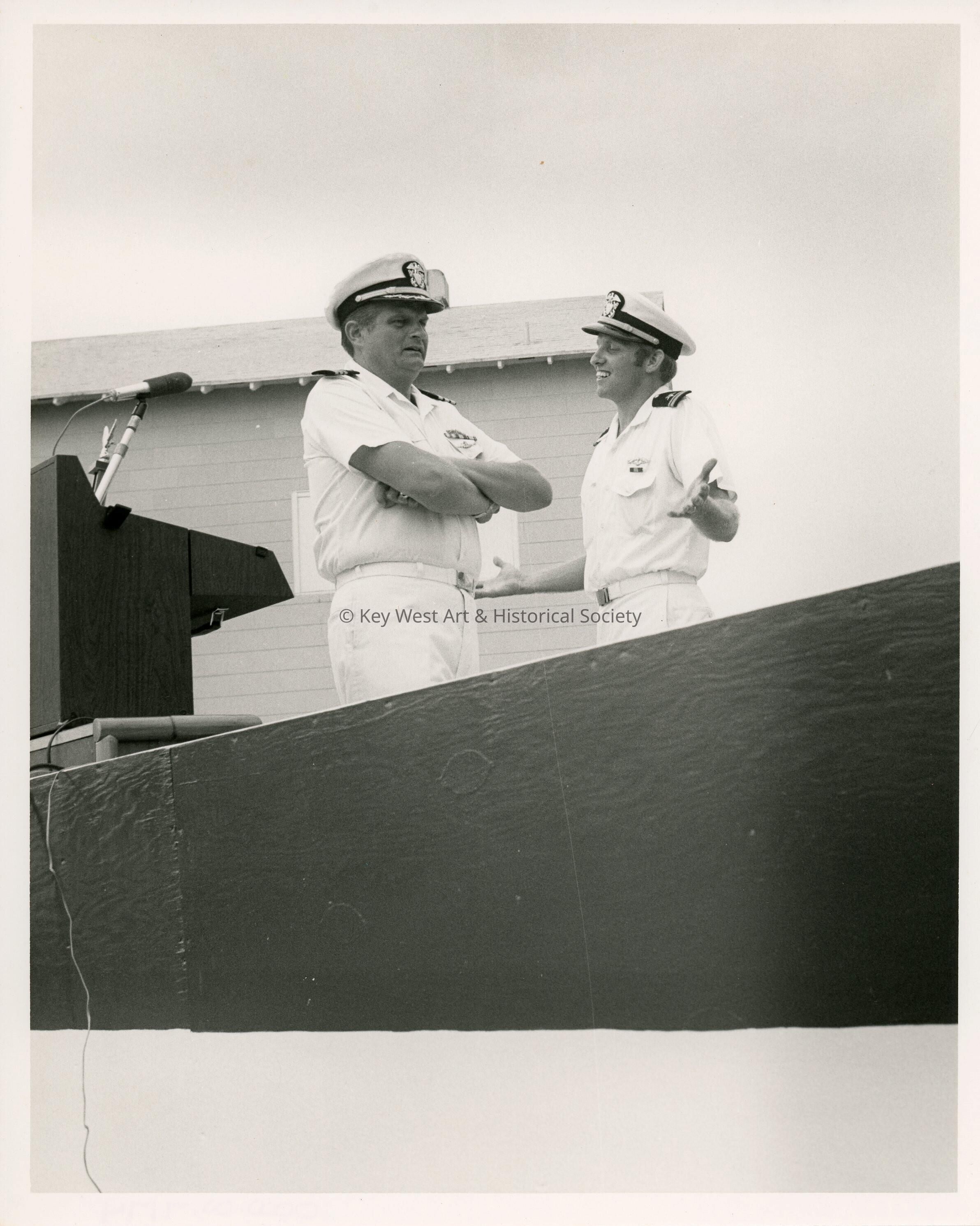2 Men in uniform talking next to a podium
