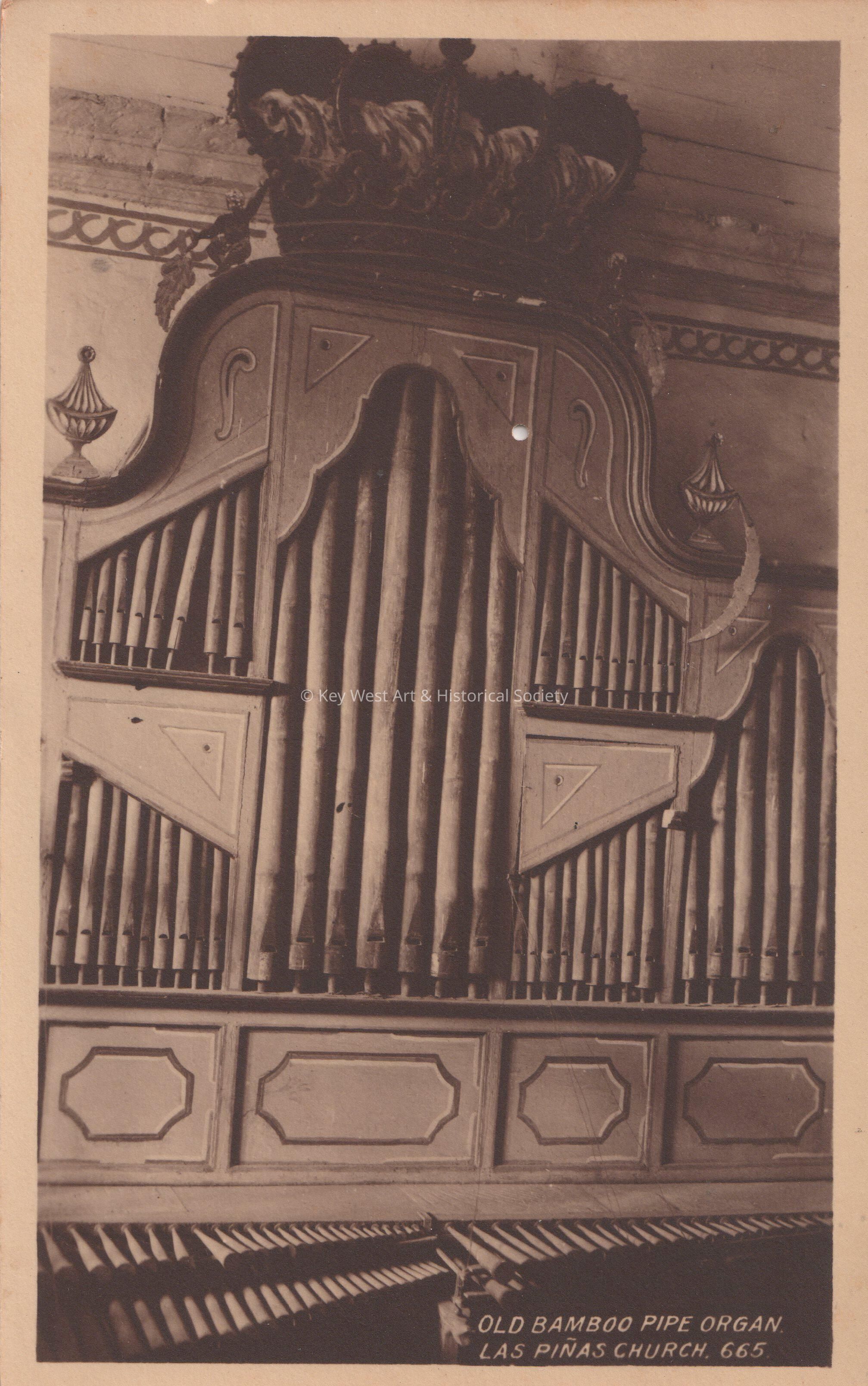 Postcard depicting a large pipe organ.  The caption reads, ‘Old Bamboo Pipe Organ, Las Pinas Church'.  The message on the verso reads, ‘Pipe Organ ___ in old Spanish Church over 100 years old.’Subject Place