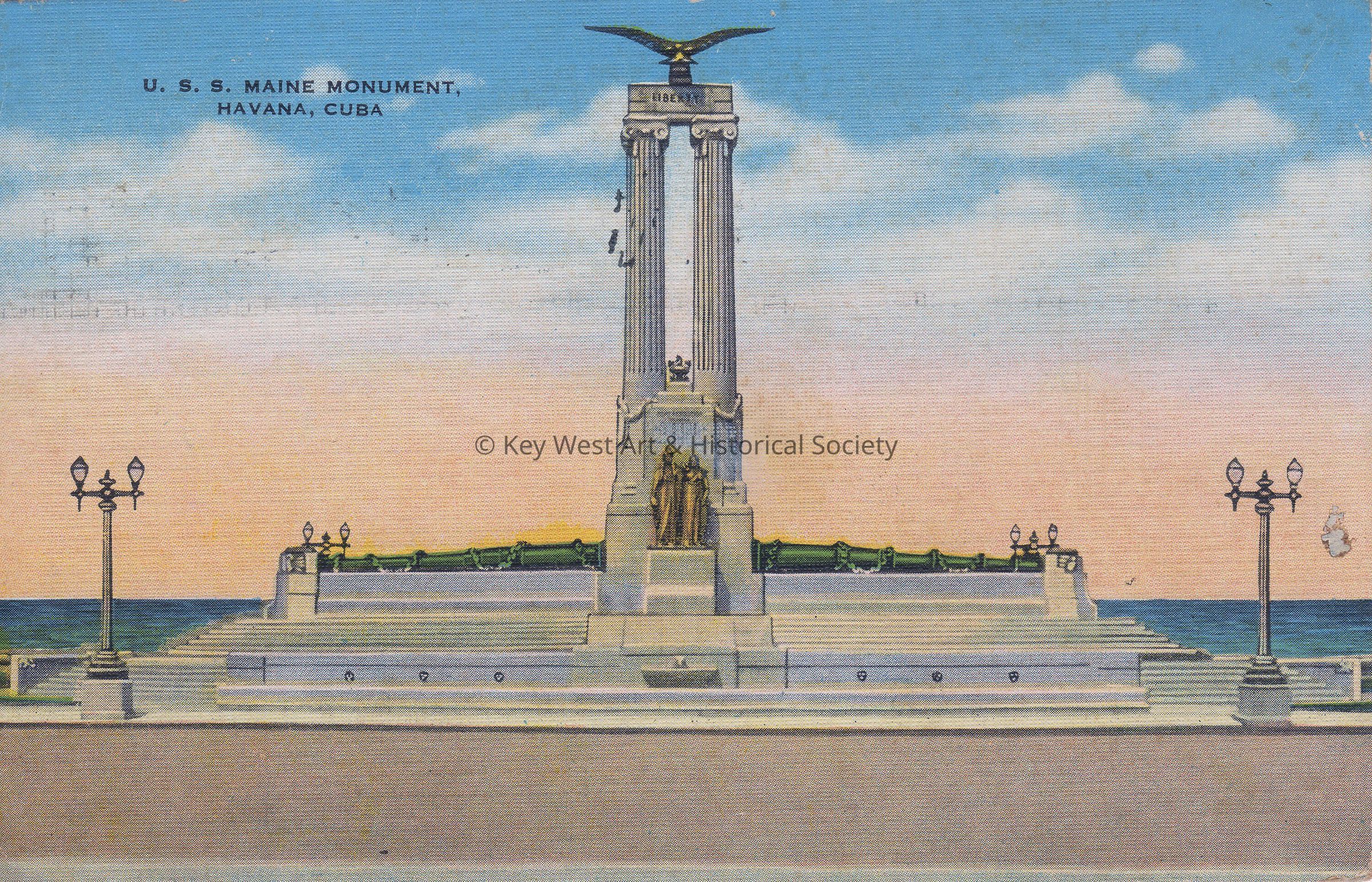 Postcard depicting the USS MAINE memorial monument in Havana, Cuba. The caption reads, ‘USS Maine Monument, Havana, Cuba’. Notation on verso, ‘Built by the people of Cuba in grateful memory of the crew of the ill-fated U. S. Battleship “Maine” which was blown up in the harbor of Havana, February, 1898. This catastrophe was an important factor in causing the United States to assist Cuba in her war for independence.’ The message on the verso reads, ‘July 1, 1947, I feel sure you will like to look at the picture on the other side. Hope all is well at C.M.I. Love to all, S.S. and S.M.R.’ The postcard is addressed to Sister M. Caroline, Convent, Key West, Florida, and is postmarked Havana, Cuba July 2, 1947.Subject Place