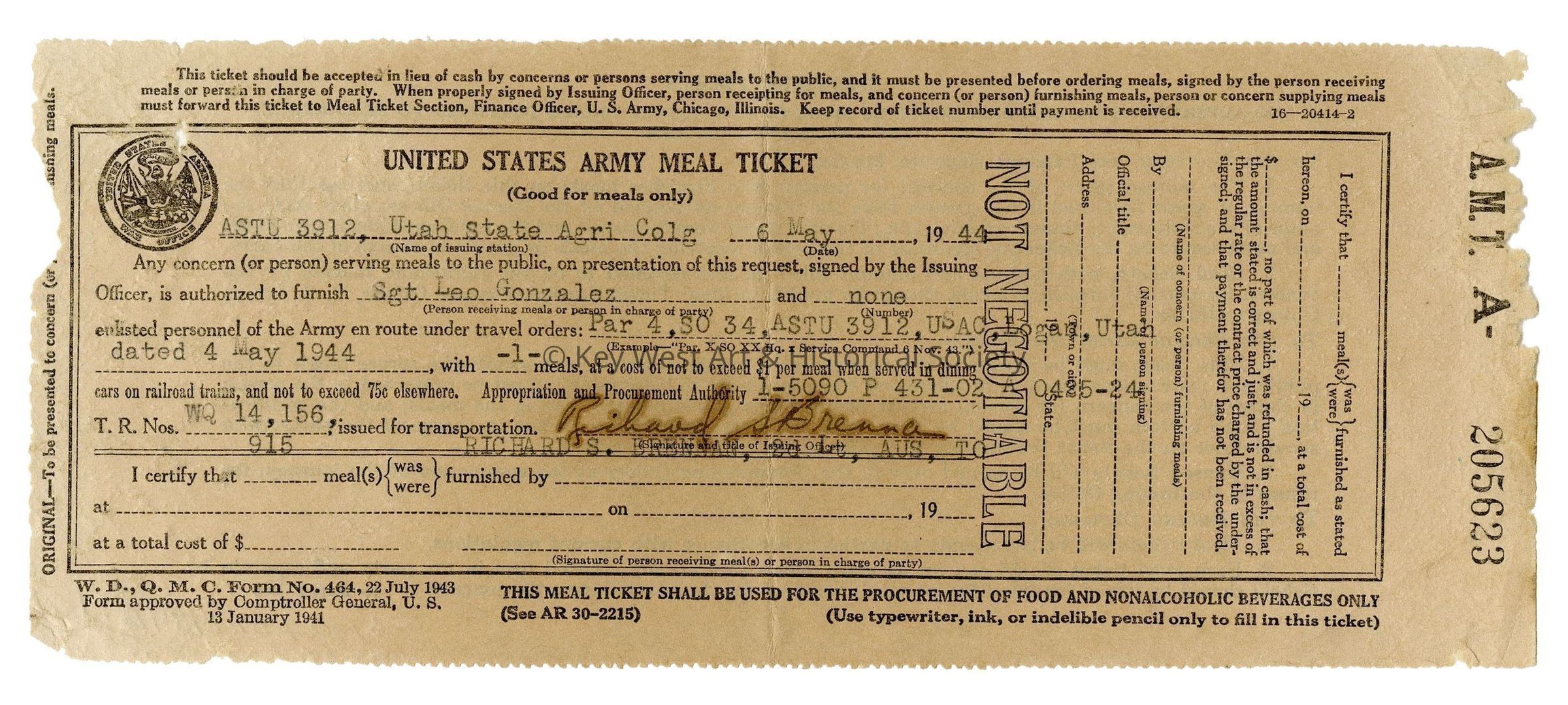 Paper World War II United States army meal ticket issued to Sergeant Leo Gonzalez for one meal dating May 6, 1944.Collection