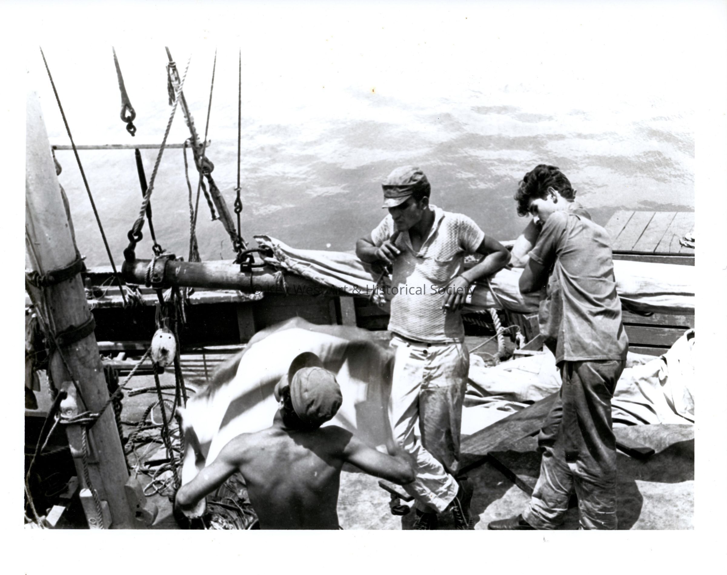 Black and white photograph of Cuban sailors onboard the ship MARTIN GUTIERREZ out of Batabano, Cuba.