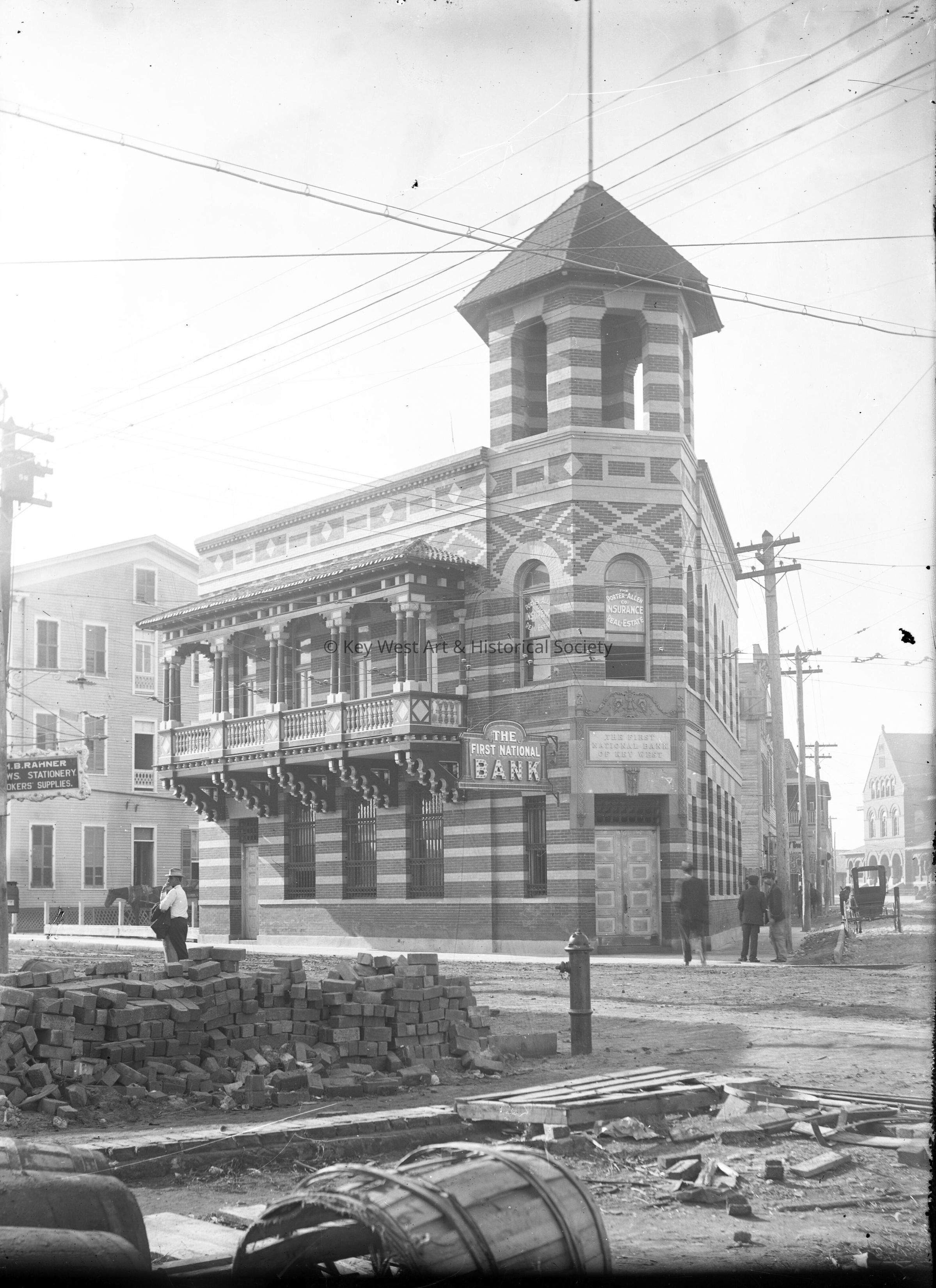 Black and white dry plate glass negative of The First National Bank of Key West building at the corner of Front and Duval streets. The Porter-Allen Insurance Company office is located on the second floor.