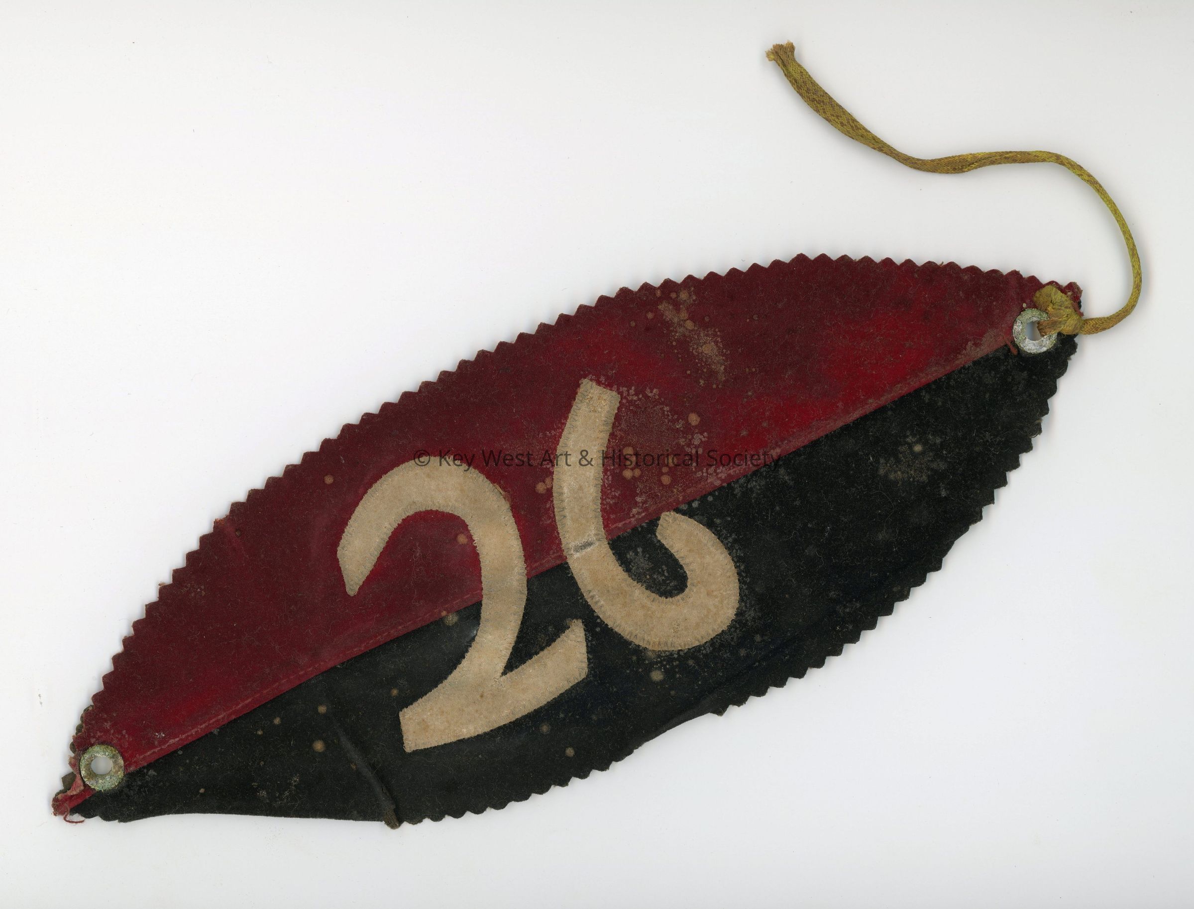Red and black velvet bullet shaped armband with the number '26' in white velvet. Worn by a member of the 26th of July Movement which was a revolutionary movement led by Fidel Castro that overthrew the regime of Fulgencio Batista in Cuba in 1959. This armband was said to have been worn by Lieut. Benito Atamore, who was born in Key West on July 4, 1910. He belonged to Castro's underground in Havana for some time until he fled and became an officer of the Second National Front of Escambray (Segundo Frente Nacional del Escambray). Its name commemorates an attack on the Santiago de Cuba army barracks on July 26, 1953. The movement began formally in 1955 when Castro went to Mexico to form a disciplined guerrilla force.Collection
