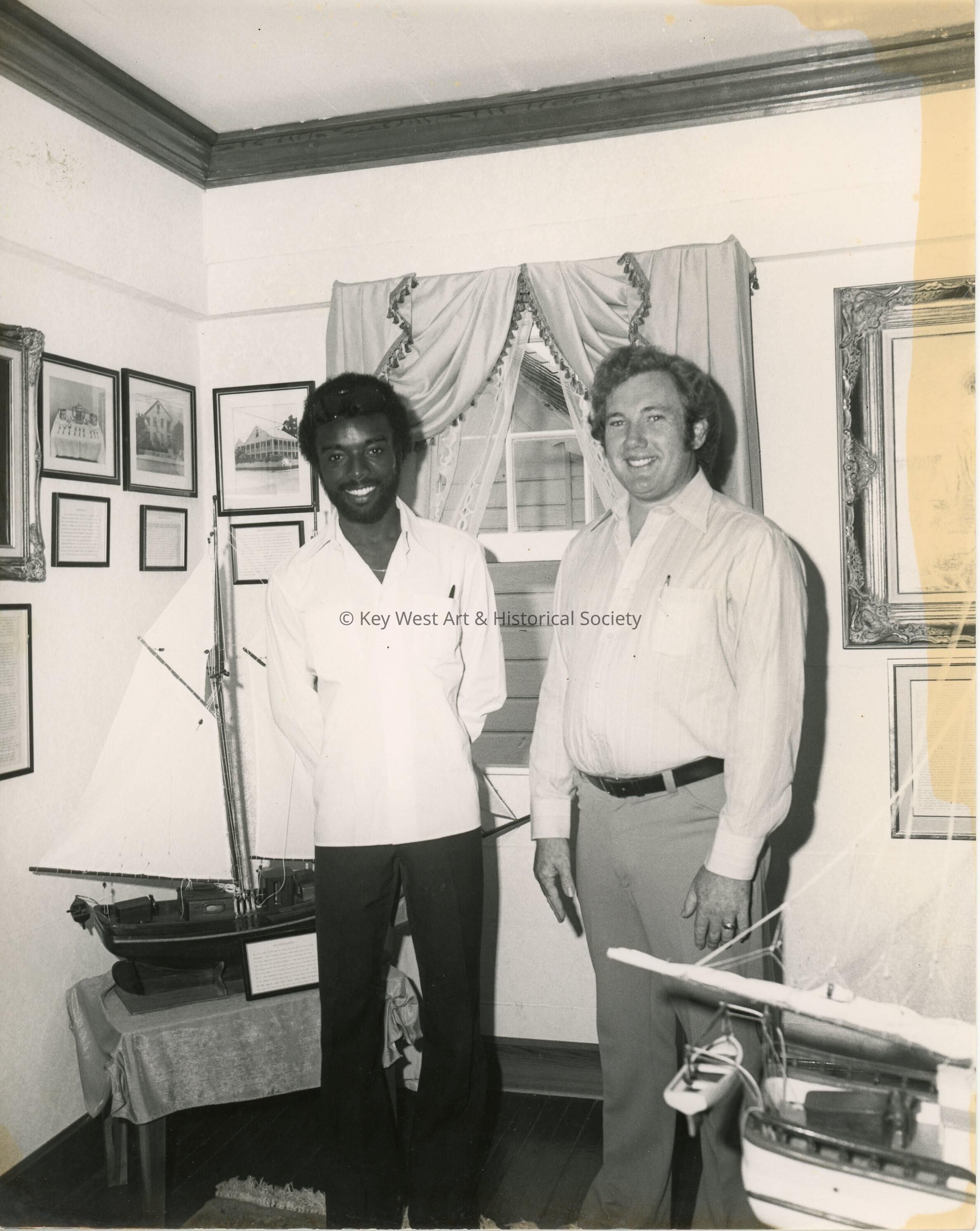 Black and white photograph of Alton Lowe (right) and an unknown man inside the Albert Lowe Museum, New Plymouth, Green Turtle Cay, Abaco, Bahamas.Photograph Details