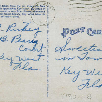 Postcard depicting an aerial view of Key West from the east. Notation on verso reads, ‘Highway Approach and Key West, Florida from the Air. This excellent view taken from the air, shows the New Overseas Highway as it approaches Key West. By virtue of this great scientific marvel, a very fine climate, marvelous fishing waters and great tropic beauty, Key West takes its place in the forefront of resort cities.’Subject Place