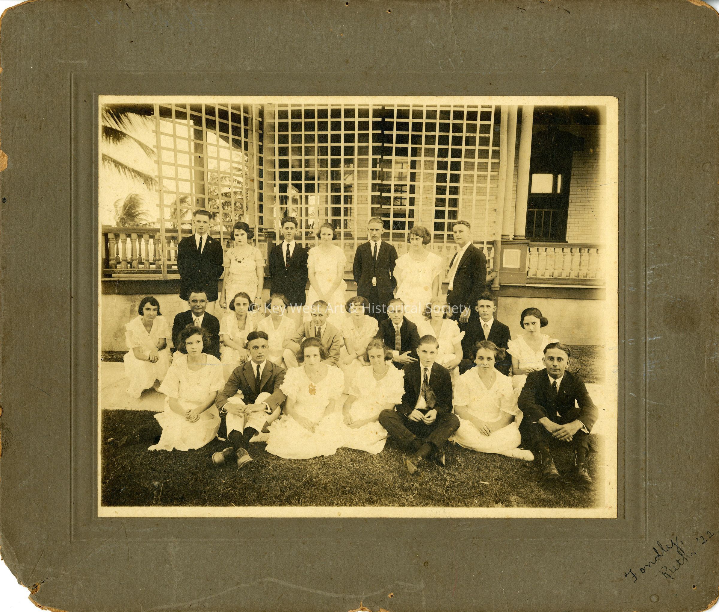 Black and white photograph of a group of young people, possibly students, taken on the lawn outside of the Southernmost House.  Inscribed on the bottom right corner 'Fondly, Ruth, '22'.Photograph Details