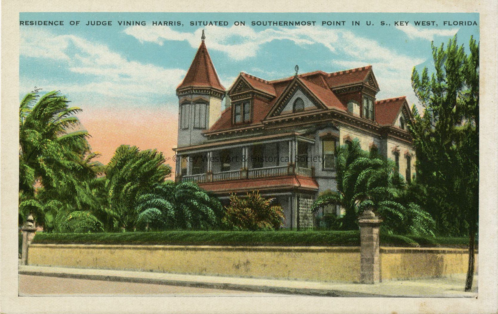 Postcard depicting the residence of Judge Vining Harris, situated on Southernmost Point in the U.S., Key West, Florida. "The Judge Vining Harris home is situated on the Southernmost point of the United State, built of red brick and with wide verandas in a beautiful garden on the ocean side of the island."Collection