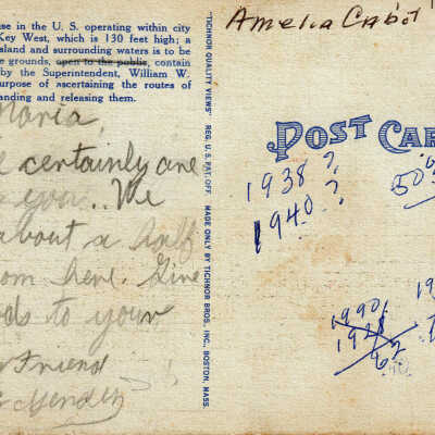 Postcard depicting cars and foliage in front of the Key West Lighthouse.  The caption reads, ‘The only Lighthouse in United States entirely within city limits, Key West, Florida.’  A handwritten note on the front points to the lighthouse and reads, ‘We live half a block from here.’  Notation on verso reads, ‘The only lighthouse in the U.S. operating within city limits is this one in Key West, which is 130 feet high; a splendid view of the island and surrounding waters is to be had from its top.  The grounds, open to the public, contain an aviary, operated by the Superintendent, William W. Demerritt, for the purpose of ascertaining the routes of migratory birds by banding and releasing them.'Subject Place