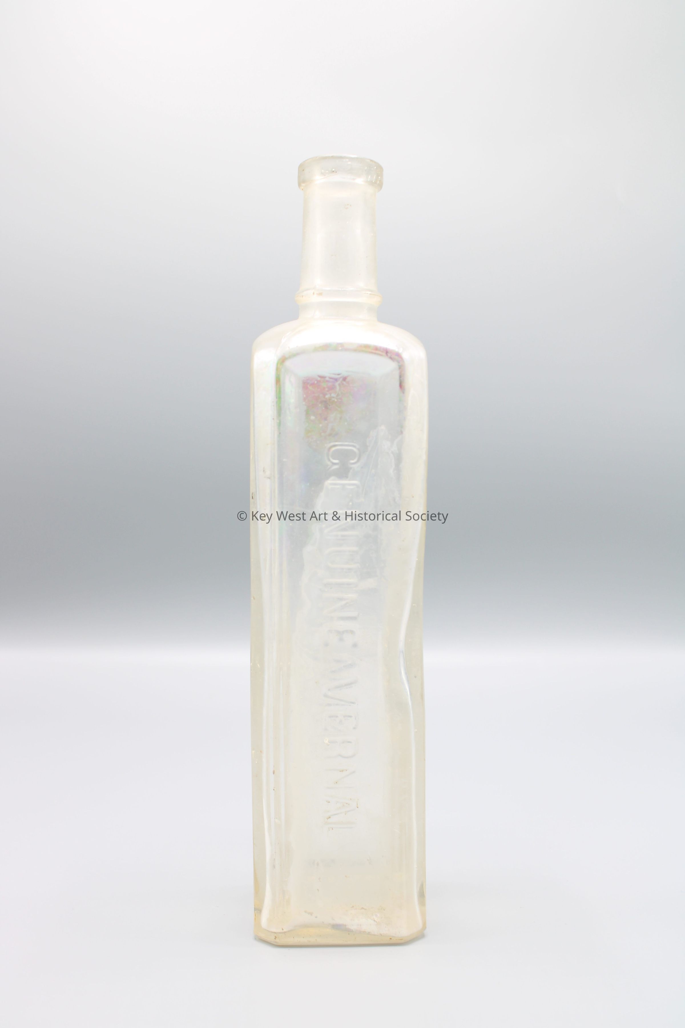 Clear glass bottle with embossing around the body that reads 'Genuine Vernal' 'Saw Palmetto' 'Berry Wine' Buffalo, N.Y.' The bottle was originally excavated by the donor's mother, Grace Curlee, during the restoration of Fort Zachary Taylor in the 1960s.Collection
