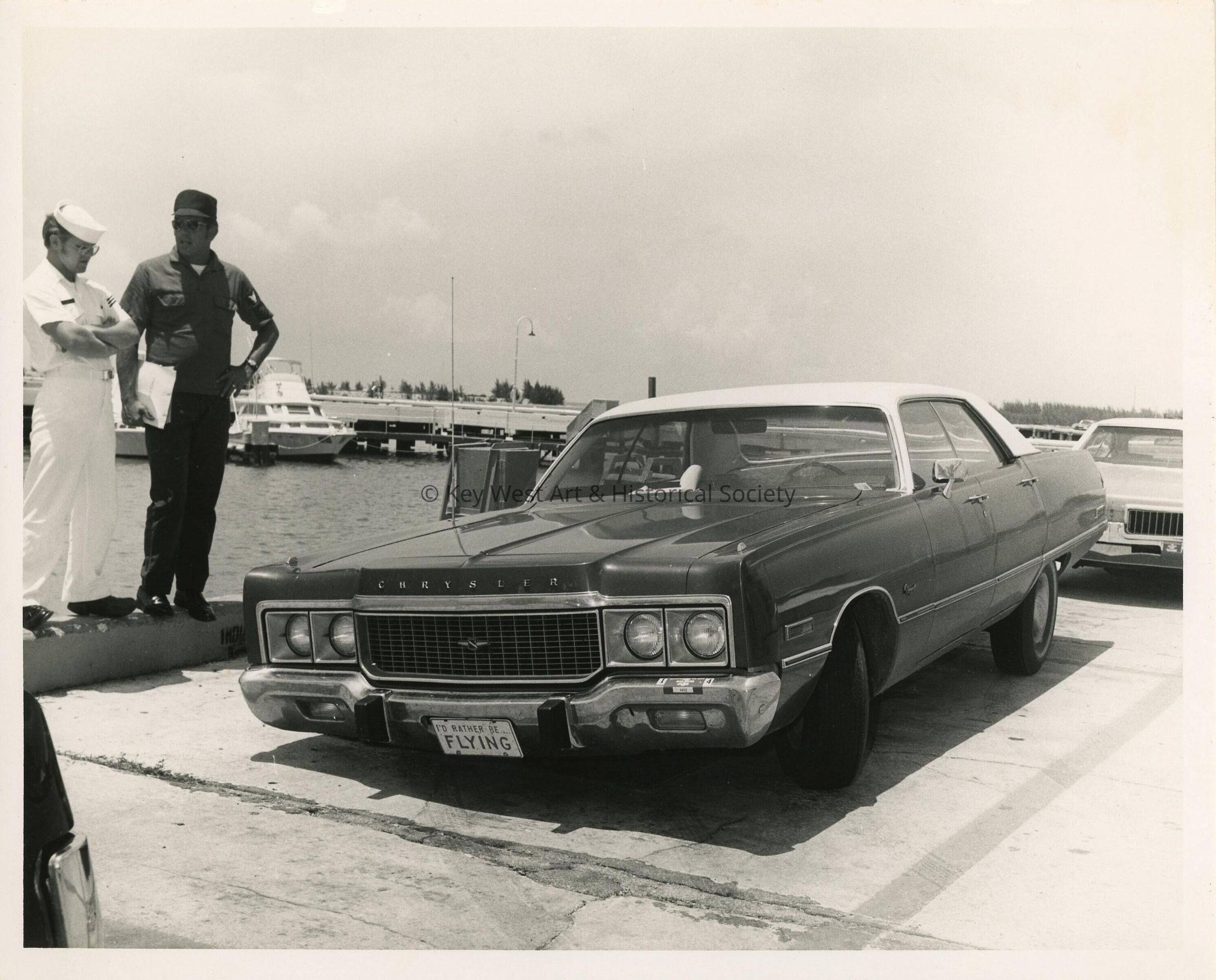 2 Unknown men in uniform standing on a pier next to an old carEntry/Object ID
