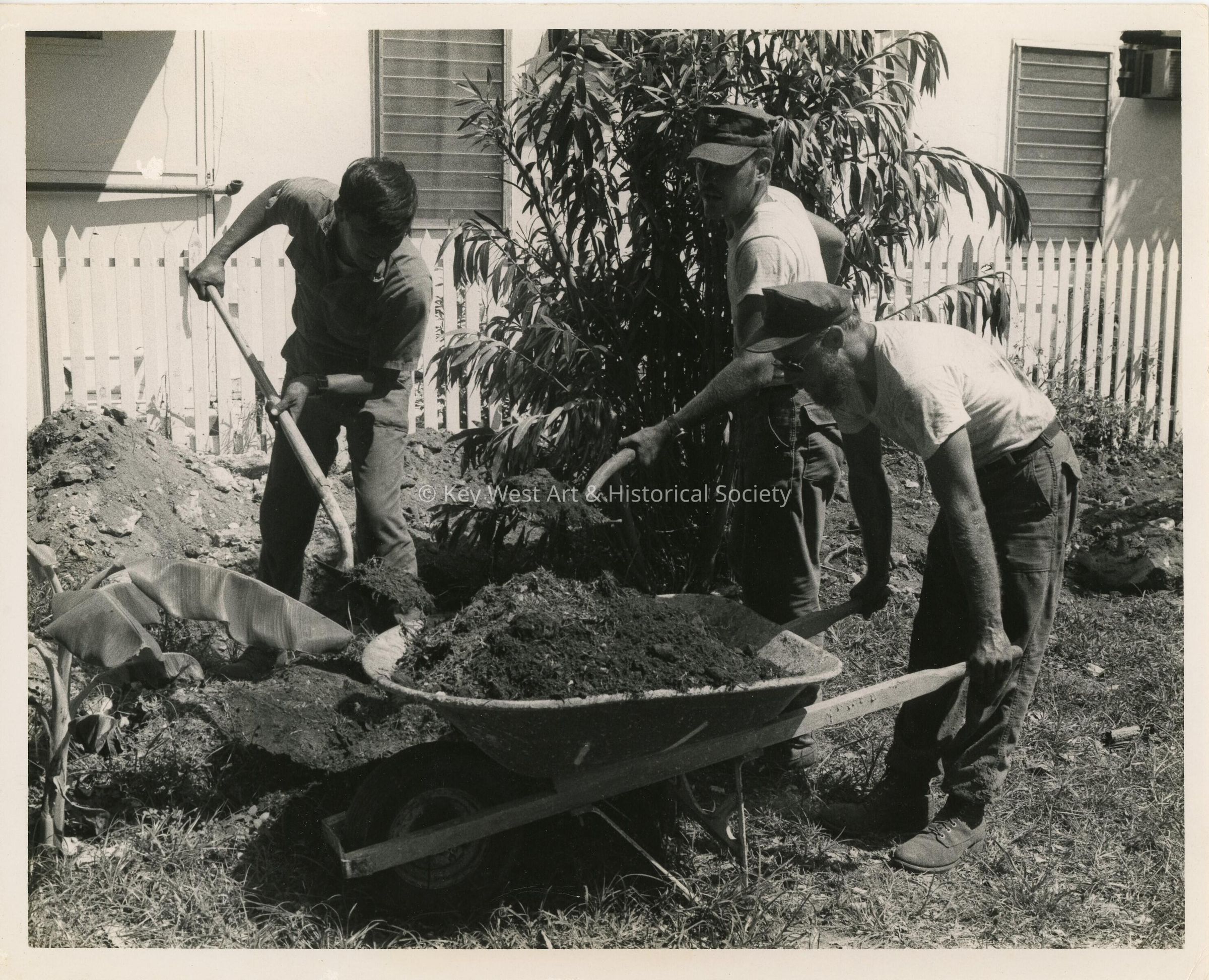 3 Unknown men cleaning a yard.