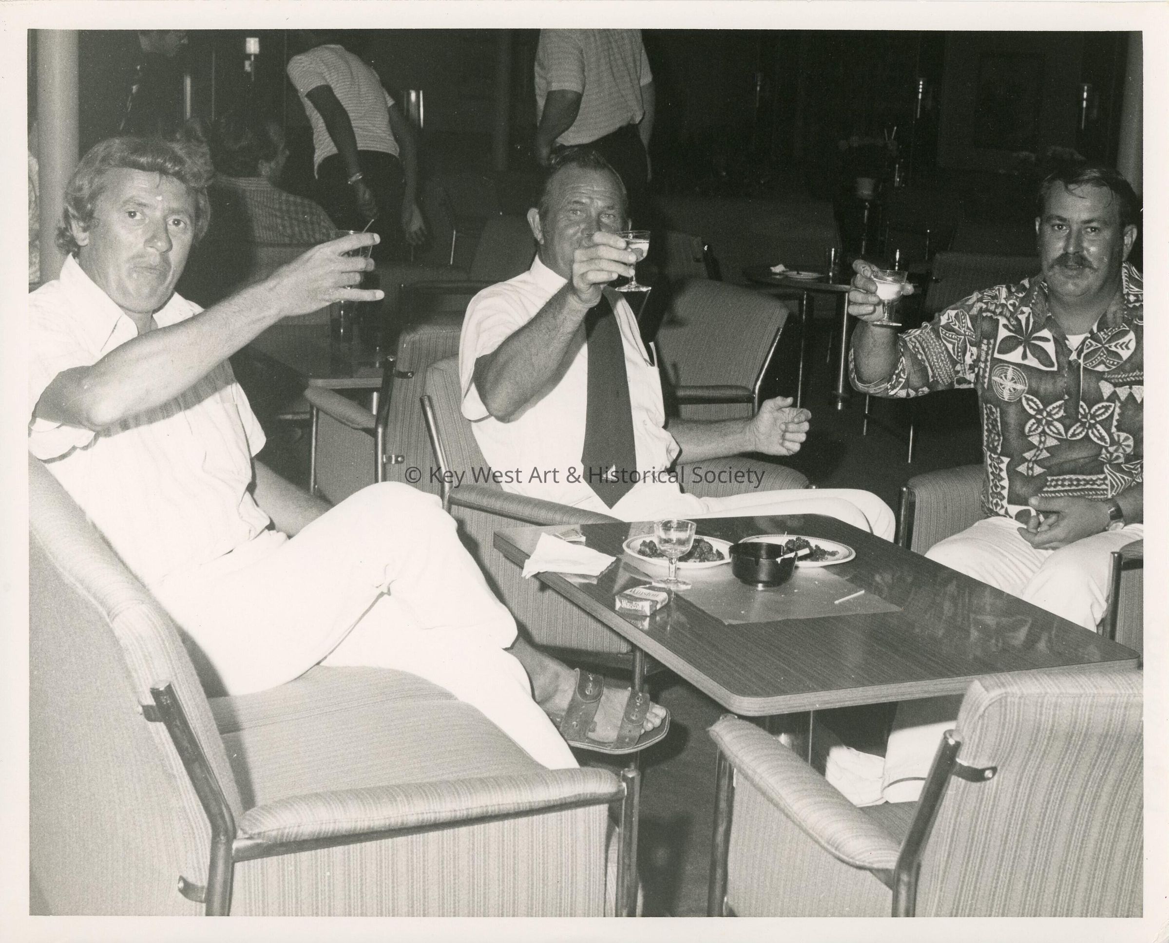 3 Unknown men sitting at a table holding drinks up.Collection