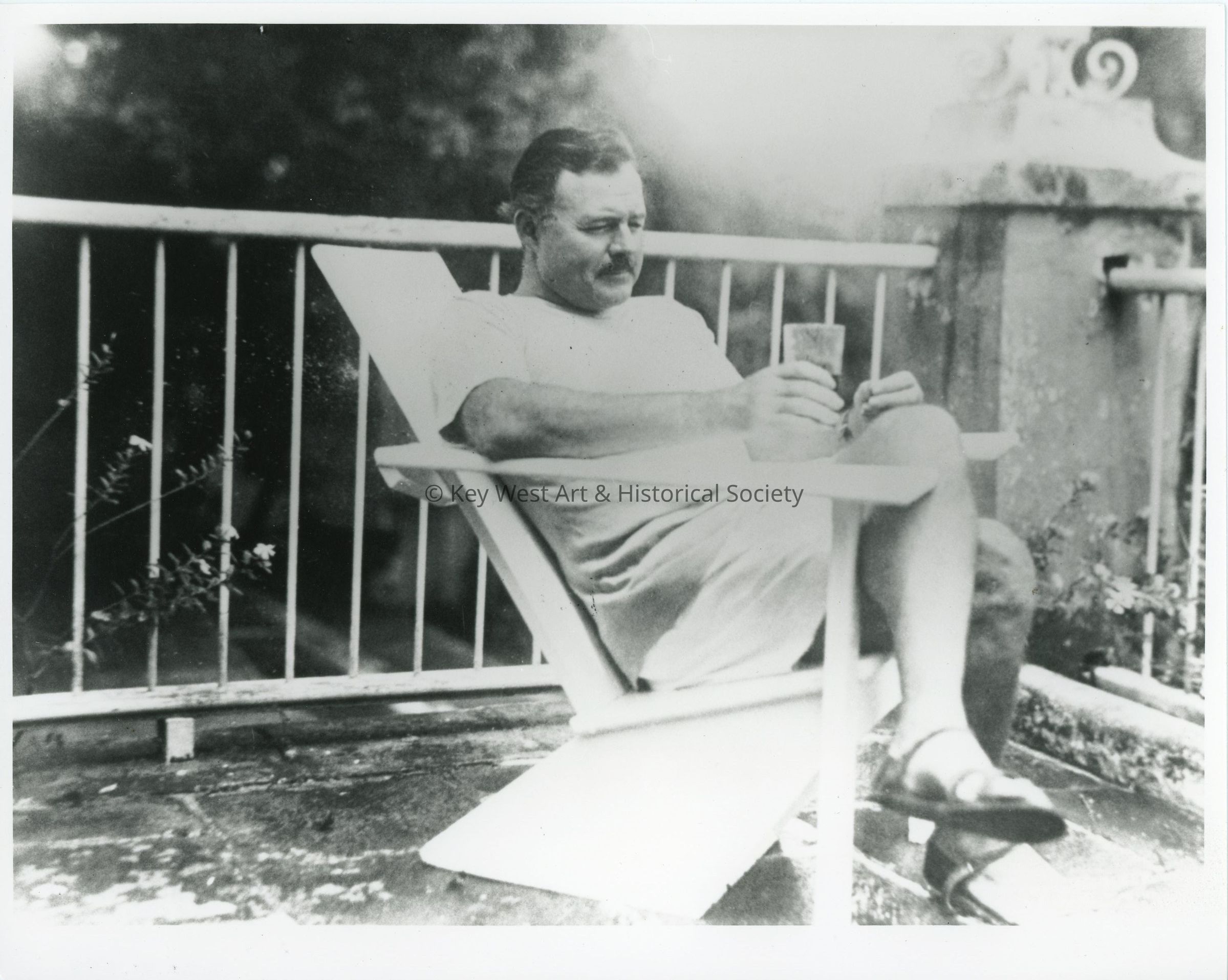 Black and white photograph of Ernest Hemingway at his home at the Finca Vigía plantation outside of Havana, Cuba.