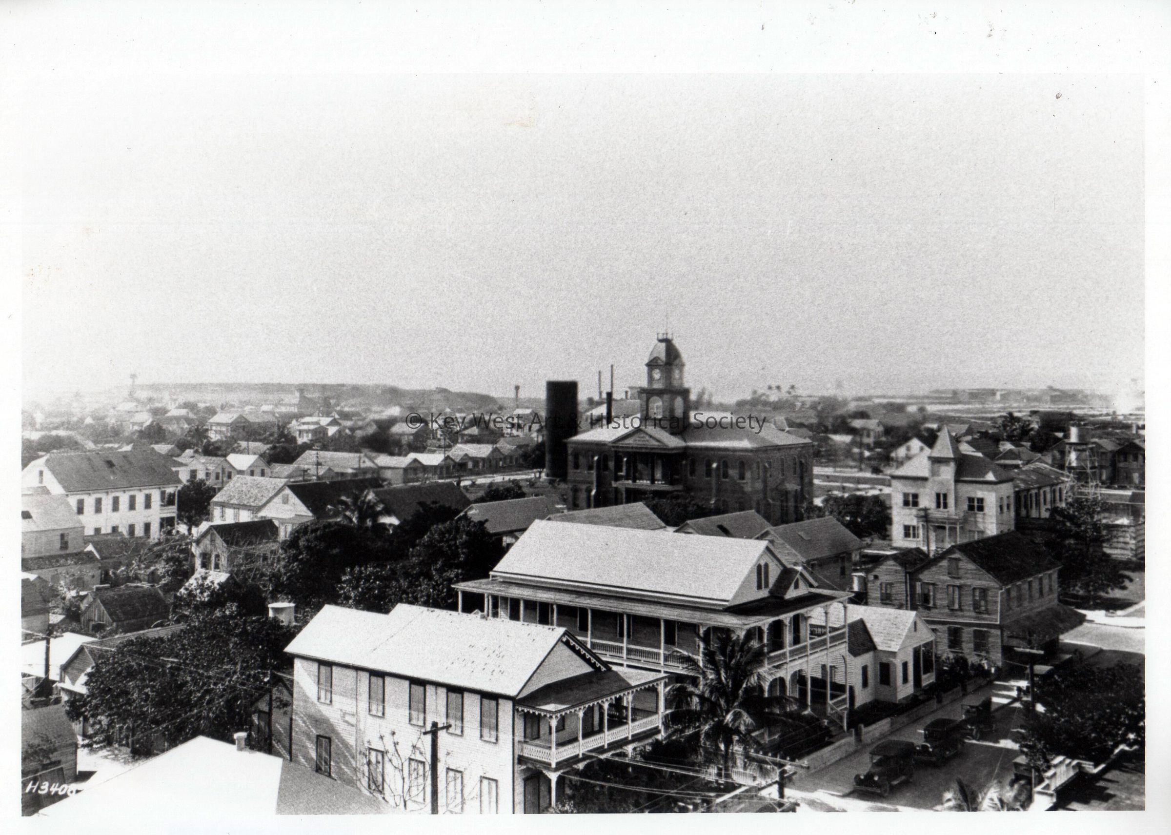 Black and white photograph of the 400 block of Fleming Street looking westward toward the Monroe County Courthouse and the Key West jail.