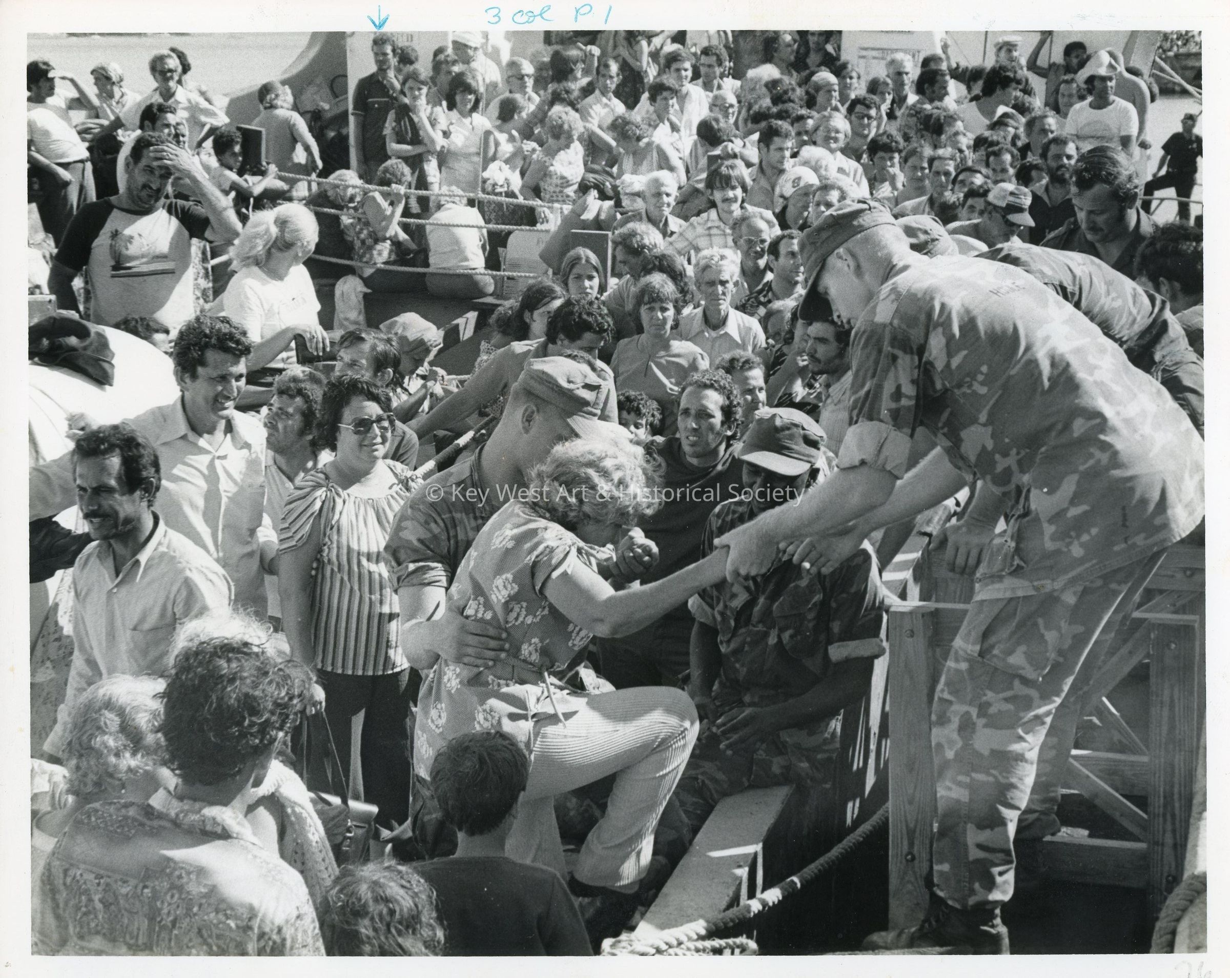 Black and white photograph of US Marines from Camp Lejeune assisting Cuban refugees at Naval Station Key West during the Mariel Boatlift.