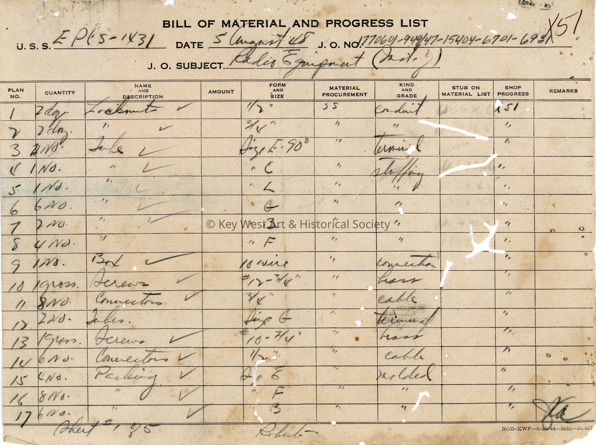 List and description of materials used in the installation of MAR/RDR radio equipment on the USS EPCS-1431 at Naval Station Key West. Page 1/8.