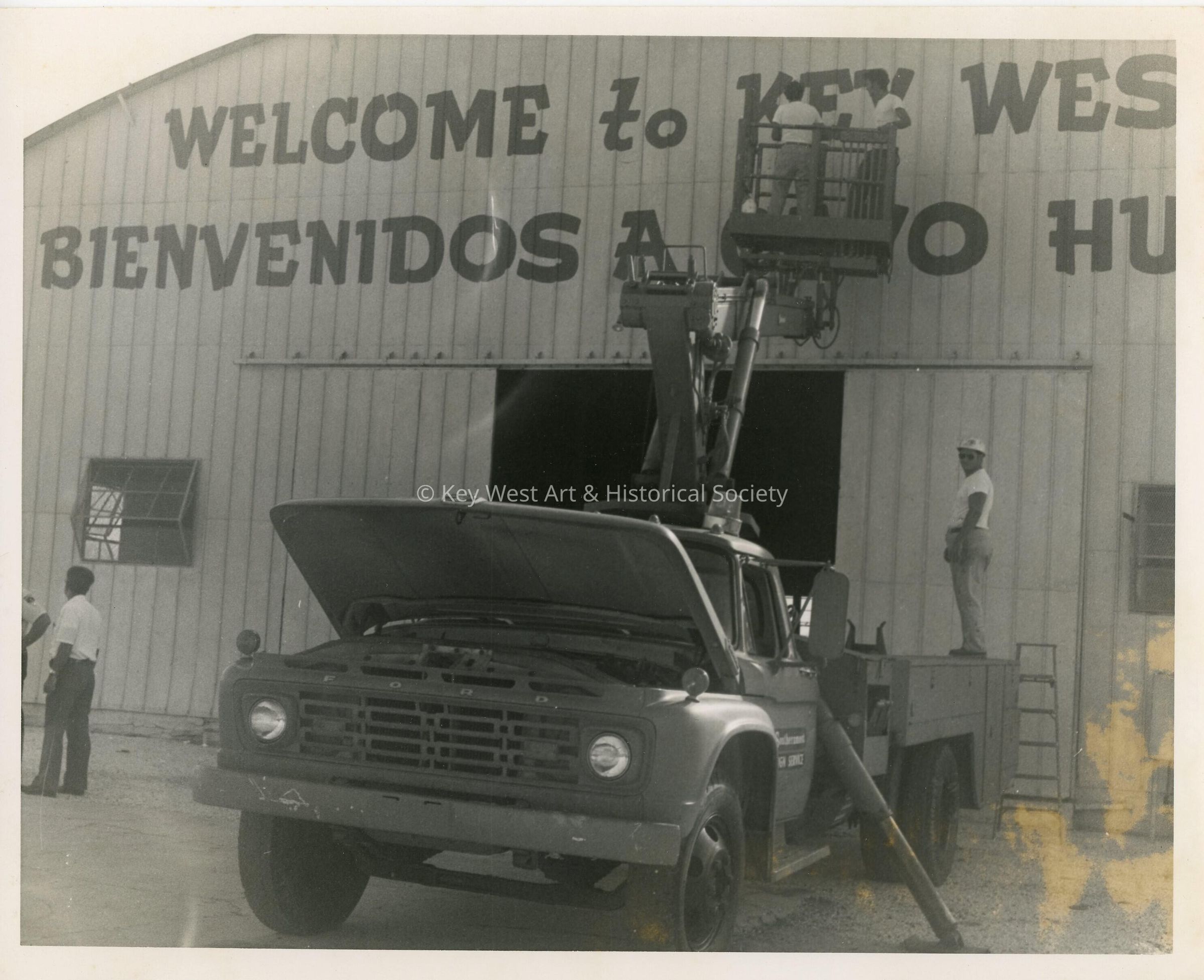 A truck putting up a sign on a building