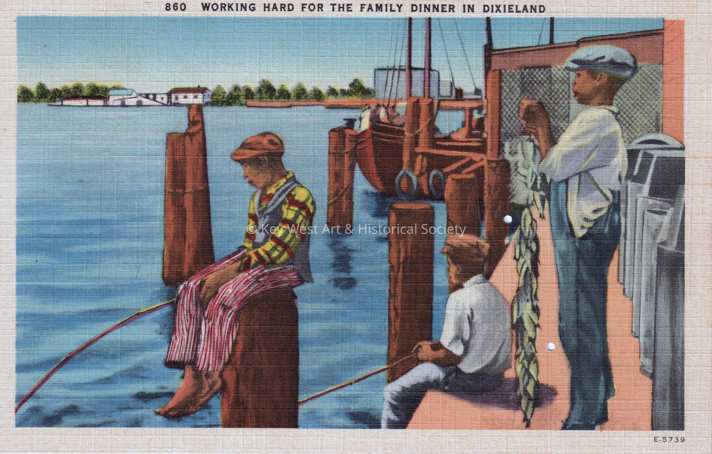 Postcard depicting boys on the docks with fishing poles and fish.  The caption reads, ‘Working Hard for the Family Dinner in Dixieland’.Collection