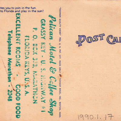 Postcard depicting pelicans in the water.  The caption reads, ‘Mother and Baby Pelicans, Florida.  Greetings from Florida.  A Gorgeous bird is the Pelican, Whose beak can hold more than his Belican, He can put in his beak, food enough for a week, But I’ll be D__D if I can see how in Helican.’  Notation on verso, ‘Ma Pelican invites you to join in the fun.  Come on Down to Florida and play in the sun!  Pelican Motel & Coffee Shop, Grassy Key – U.S. Highway #1, P.O. Box 373, Marathon, Florida Keys, U.S.A.  Excellent Rooms – Good Food.  Telephone Marathon – 2048.'Collection