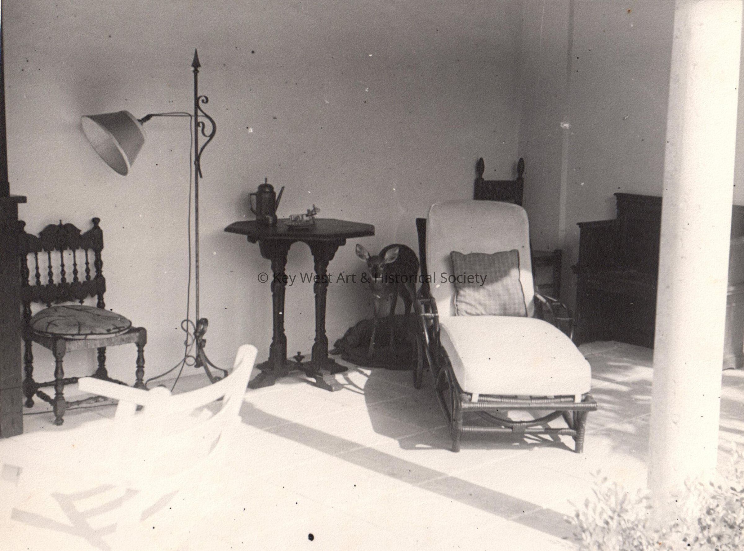 Black and white photograph Elfina the deer, owned by Mitzpah Otto deBoer, on a dog bed.Photograph Details