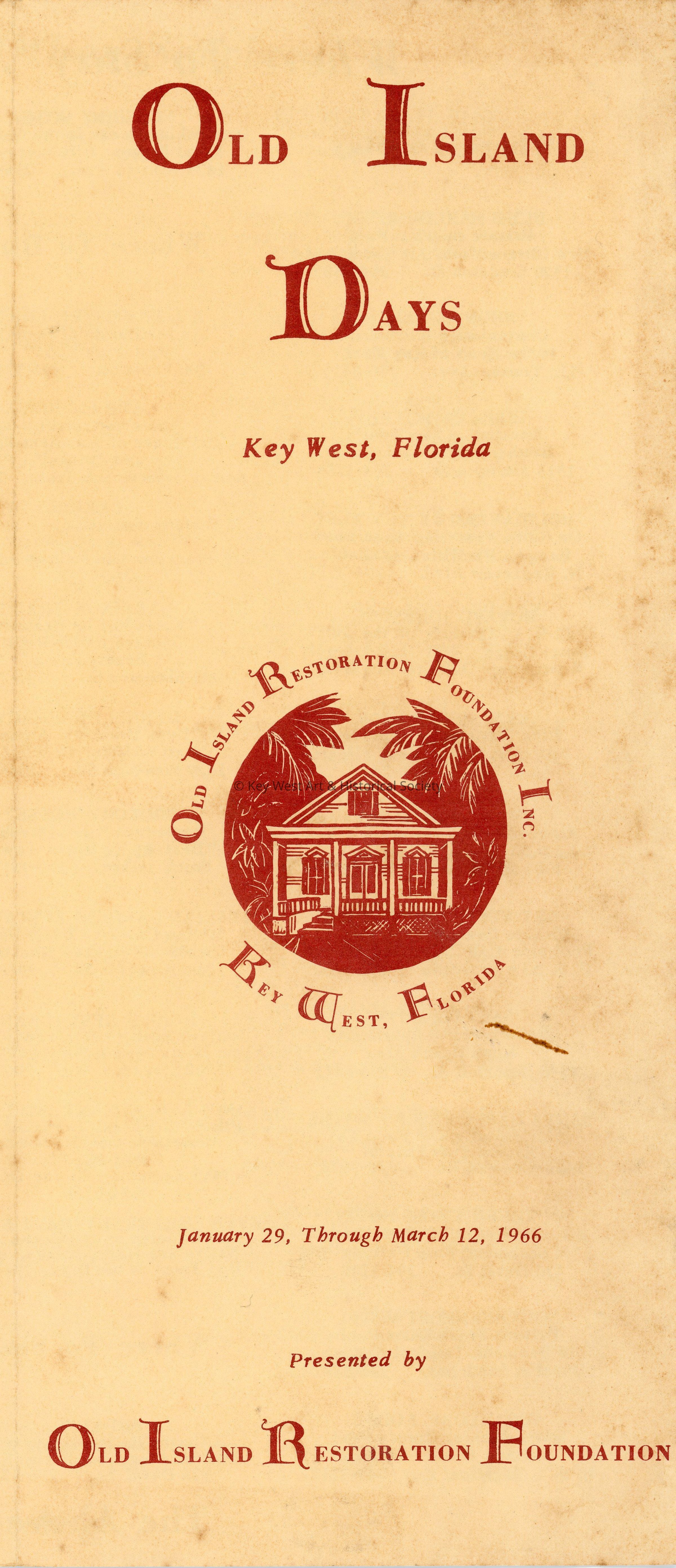 A pamphlet detailing the events of Old Island Days in Key West, held between January 29 and March 12, 1966, as presented by the Old Island Restoration Foundation. Events included a Coronation Ball, Flower Show, a presentation of 'My Fair Lady,' a Conch Shell Blowing Contest, and a Clothes Line Art Show amongst many others.Collection