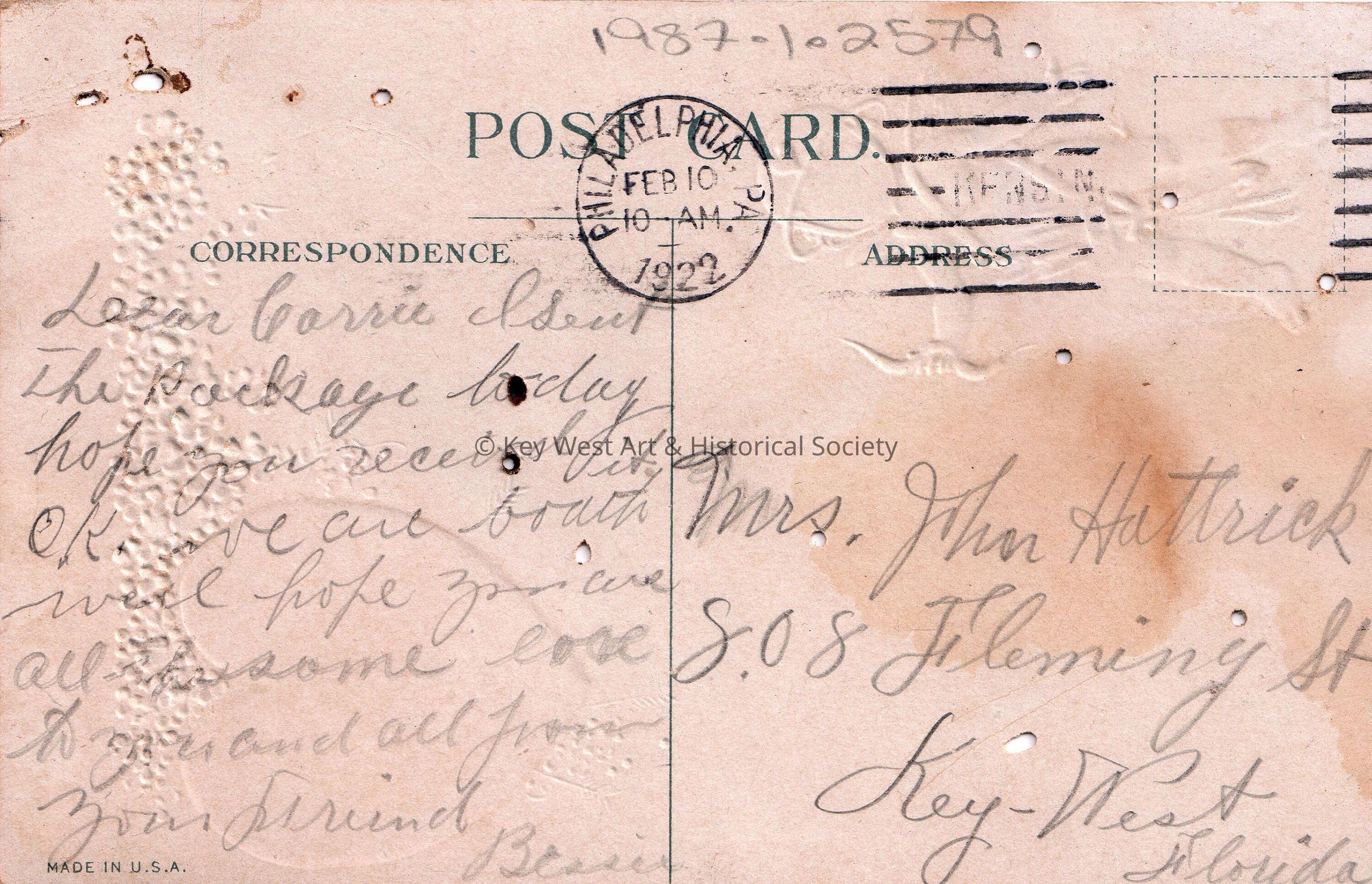 Postcard depicting a Valentine Card with the figure of Cupid.  The caption reads, ‘My Valentine, Cupid’s arrow pierced my heart with loving thoughts from a dart:  With joy that is most divine I beg you be my Valentine’.  The message on the verso reads, ‘Dear Carrie, I sent the package today, hope you received it ok.  We are both well – hope you are all the same.  Love to you and all, Forever your friend, Bessie.’  The card is addressed to Mrs. John Hattrick, 808 Fleming Street, Key West, Florida, and is postmarked Philadelphia, February 10, 1922.Collection