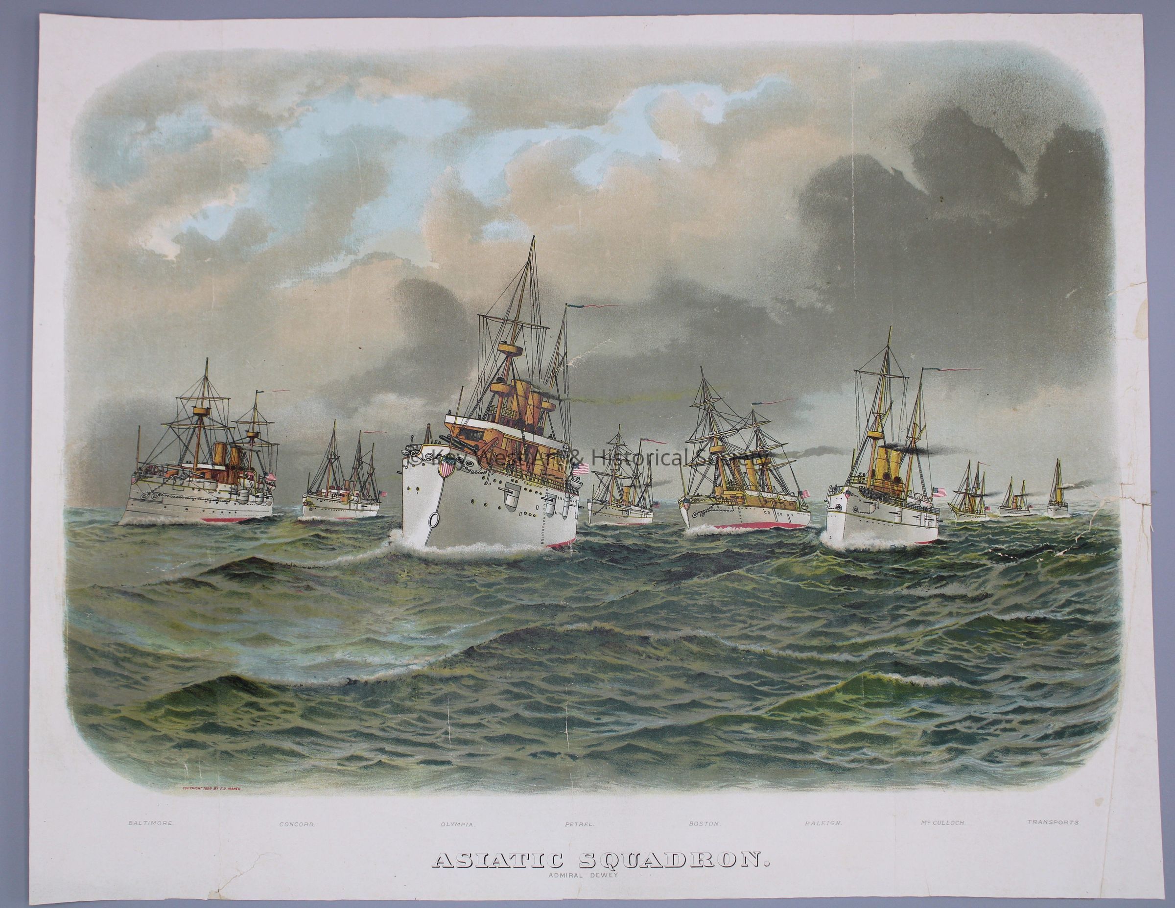 Color illustration print of the Asiatic Squadron under Admiral George Dewey during the Spanish American War. The United States Navy ships USS BALTIMORE, USS CONCORD, USS OLYMPIA, USS PETREL, USS BOSTON, USS RALEIGH, and USS MCCULLOCH were all present during the Battle of Manila Bay.Artwork Details