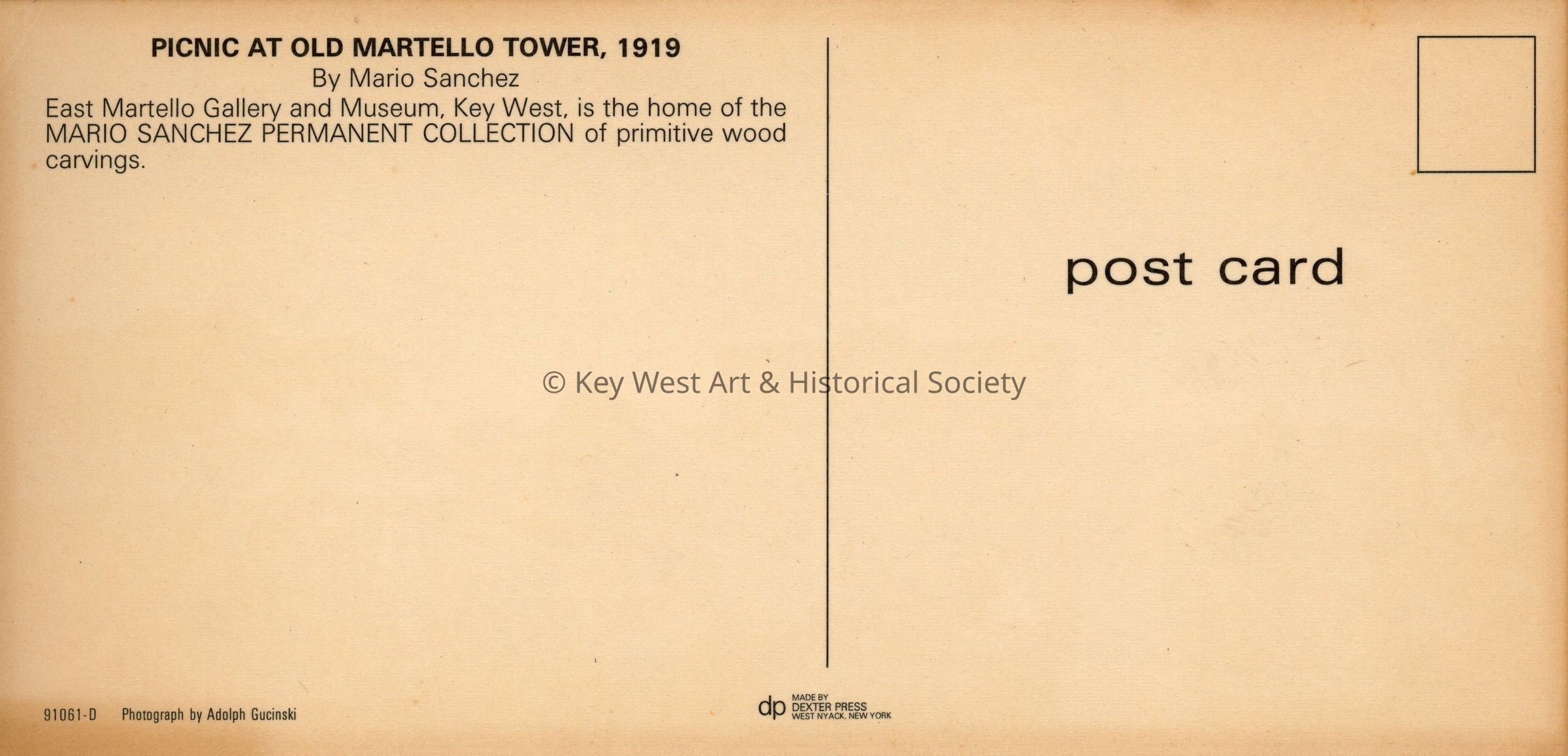 Postcard depicting a wood carving by Mario Sanchez. The postcard shows a picnic scene at Fort East Martello where people are outside the fort participating in various activities including flying a kite, dancing, reading and playing music. Notation on verso reads 'PICNIC AT OLD MARTELLO TOWER, 1919 By Mario Sanchez. East Martello Gallery and Museum, Key West, is home of the MARIO SANCHEZ PERMANENT COLLECTION of primitive wood carvings.'Subject Place