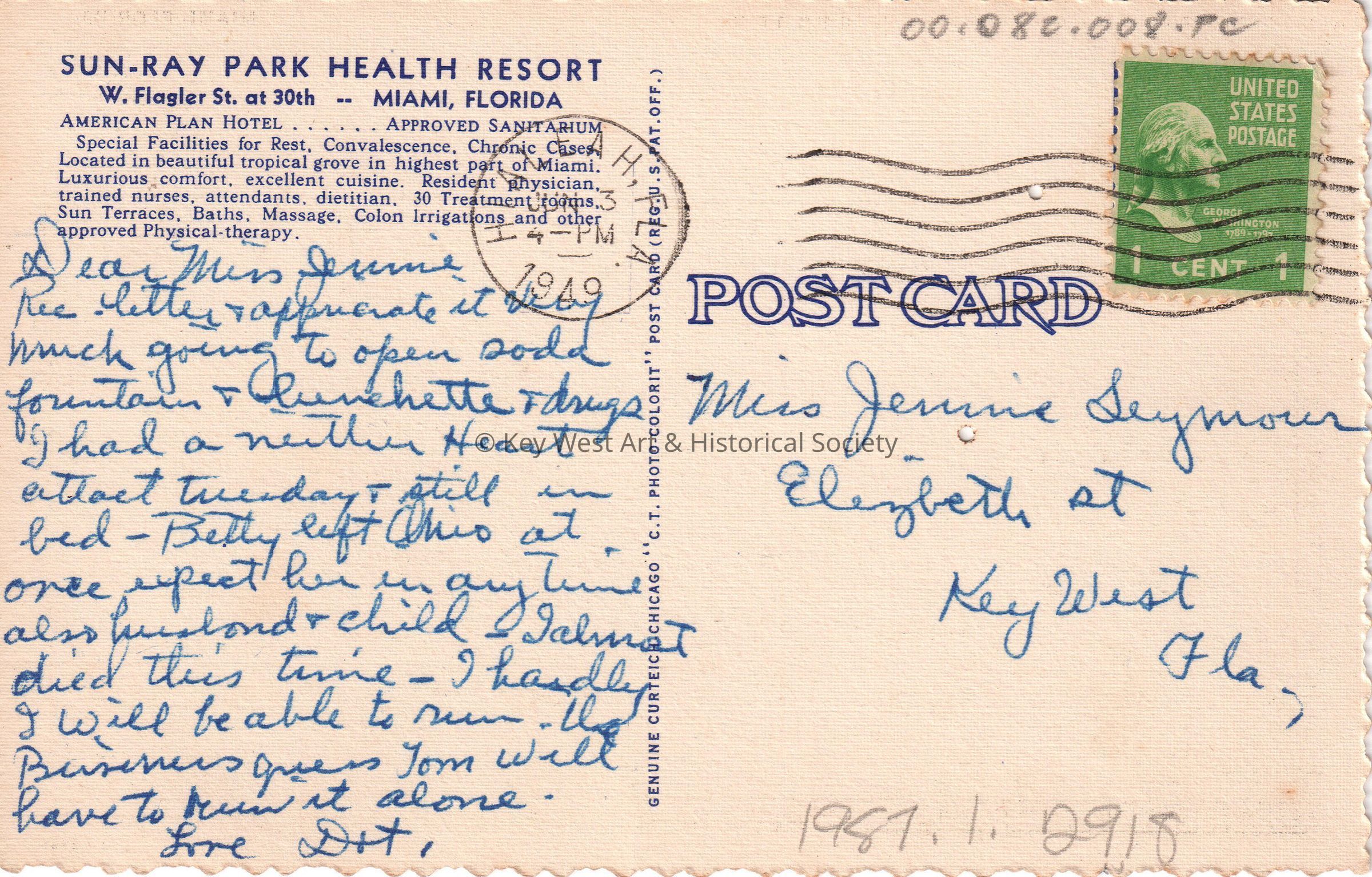 Postcard depicting a hotel in Miami. The caption reads, ‘Sun-Ray Park Health Resort, Miami, Florida.’ Notation on verso reads, ‘Sun-Ray Park Health Resort, W. Flagler Street at 30th, Miami, Florida. American Plan Hotel; Approved Sanitarium. Special Facilities for Rest, Convalescence, Chronic Cases. Located in beautiful tropical grove in highest part of Miami. Luxurious comfort, excellent cuisine. Resident physician, trained nurses, attendants, dietitian. 30 treatment rooms, sun terraces, baths, massage, colon irrigations and other approved physical therapy.’Subject Place